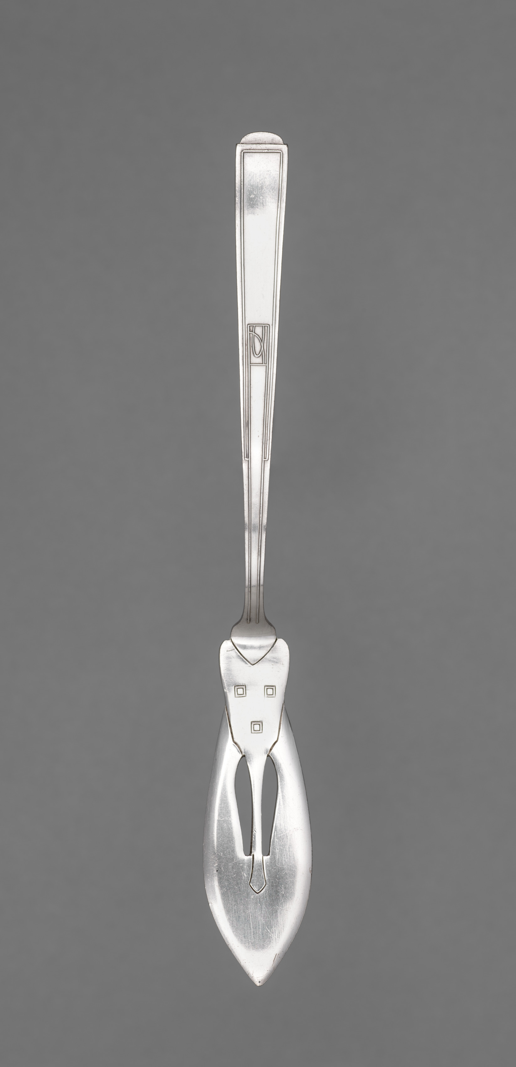 The image shows a silver fish knife. The handle is long, rectangular and narrow with a rounded top and a decorative square on the bottom left side. The blade is shaped like a leaf, with two prongs at the end. There are three small squares on the top part of the blade, arranged vertically. The background is gray on the left and white on the right. The artist of the image is Josef Maria Olbrich, and the title is Fish Knife.