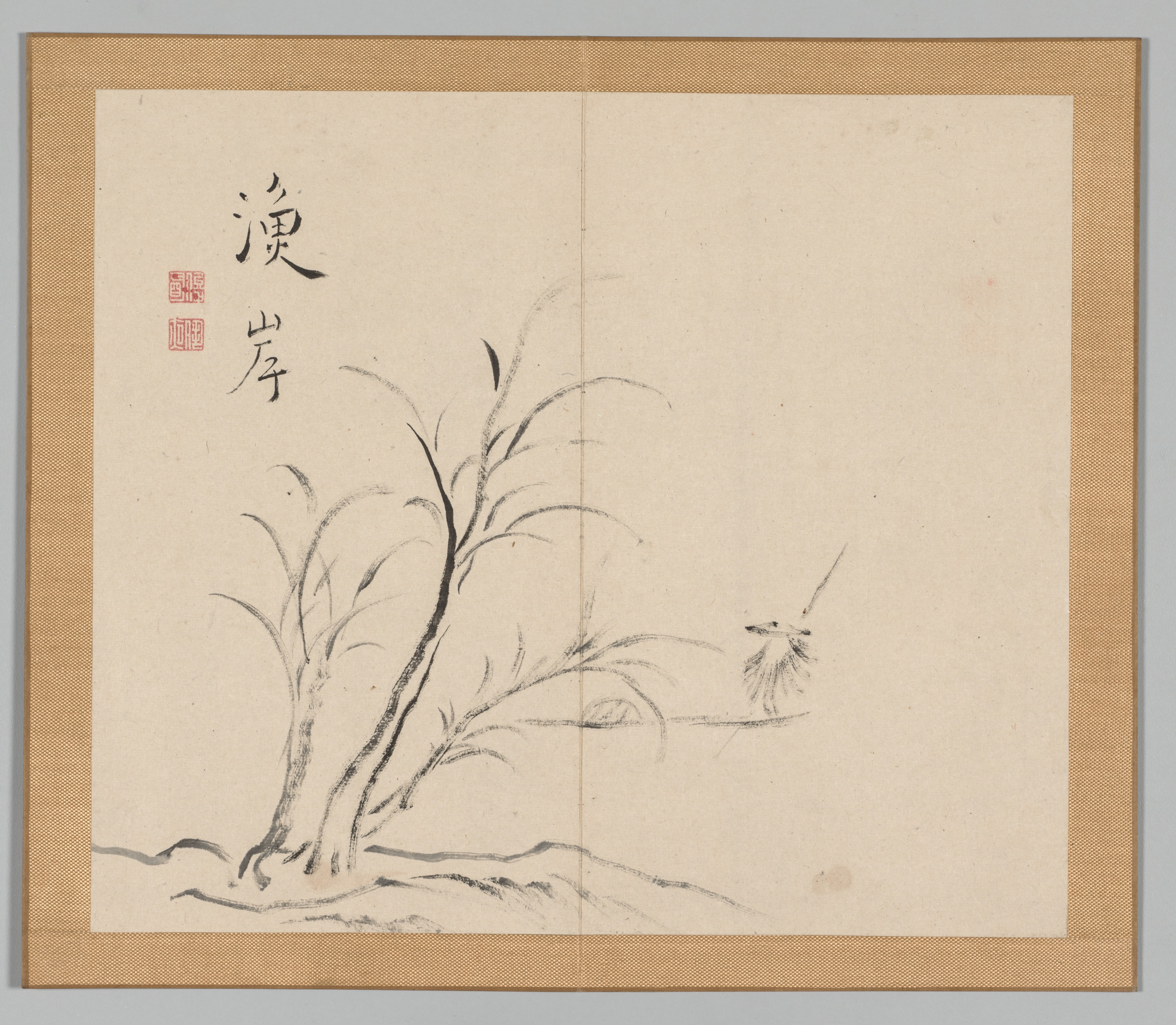 A piece of artwork with a tan background. A brown border surrounds the artwork. The artwork features a black-and-white painting of a small plant with thin curved stems. A red stamp on the top left; black ink characters are to the right of the stamp.