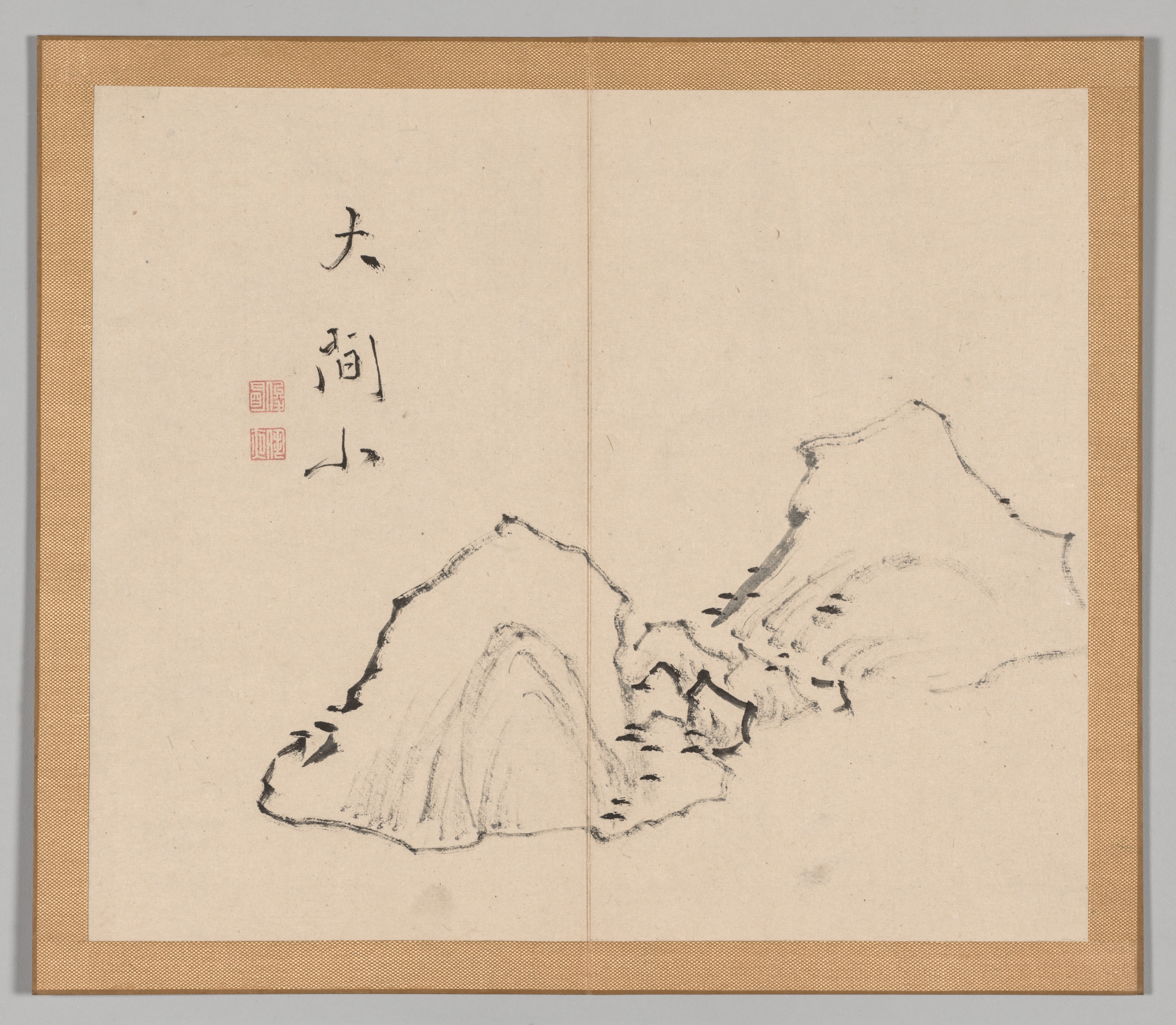 A double-page spread from a book with the title "Reverberations of Taiga, Volume 1 (leaf 6)" by Aoki Shukuya. The pages are a cream color with a brown border around them. The left page mostly blank with 1 line of black Japanese text at the top and 2 lines below it. To the left of the 2 lines are 2 small red stamps. The right page contains a black and white sketch of a mountain range. The mountains are drawn with very little detail. The left side of the mountains starts low with a rounded hump. The right side of the mountains gets progressively taller and peaks in the top right. The sketch takes up the bottom half of the page. The background behind the book is gray.