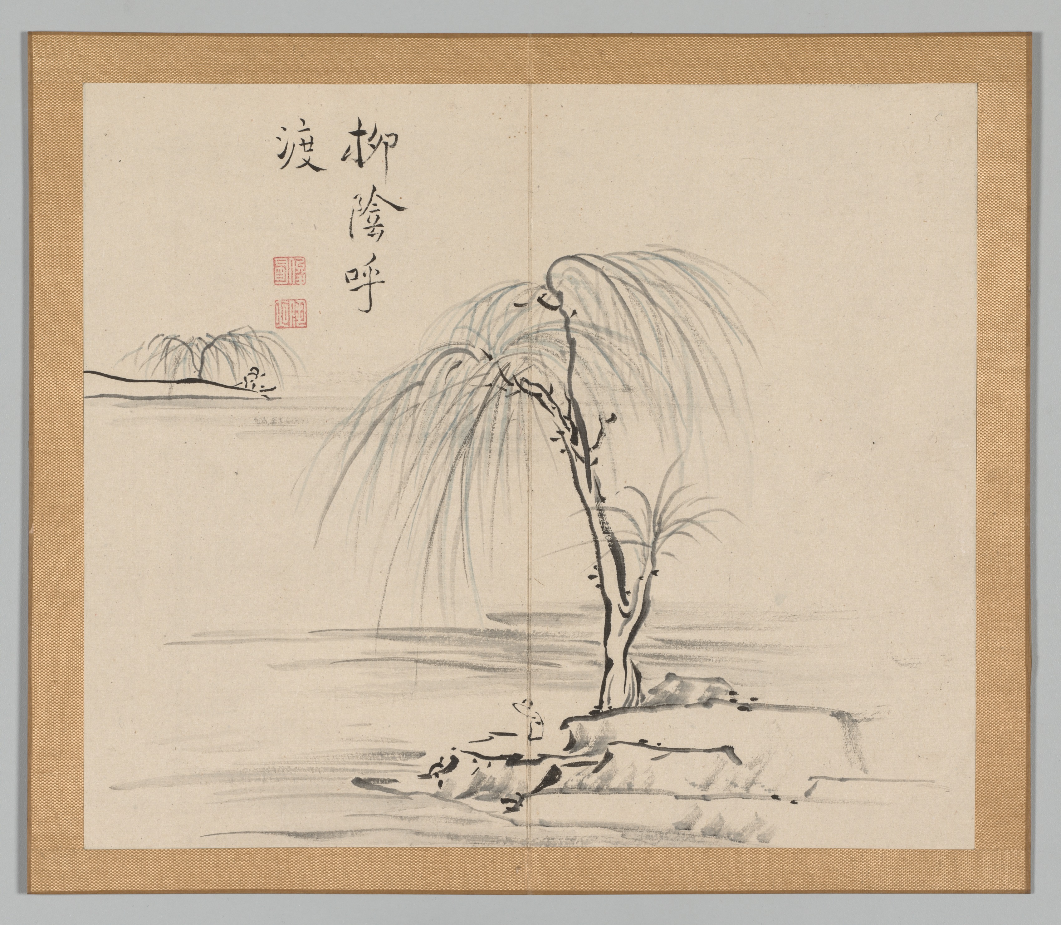 Beige artwork with brown border; black, gray and red ink; ink on paper; two-panel artwork; tree on a rock on right; mountains on left; Japanese characters and red stamps on top left; a figure beside tree.
