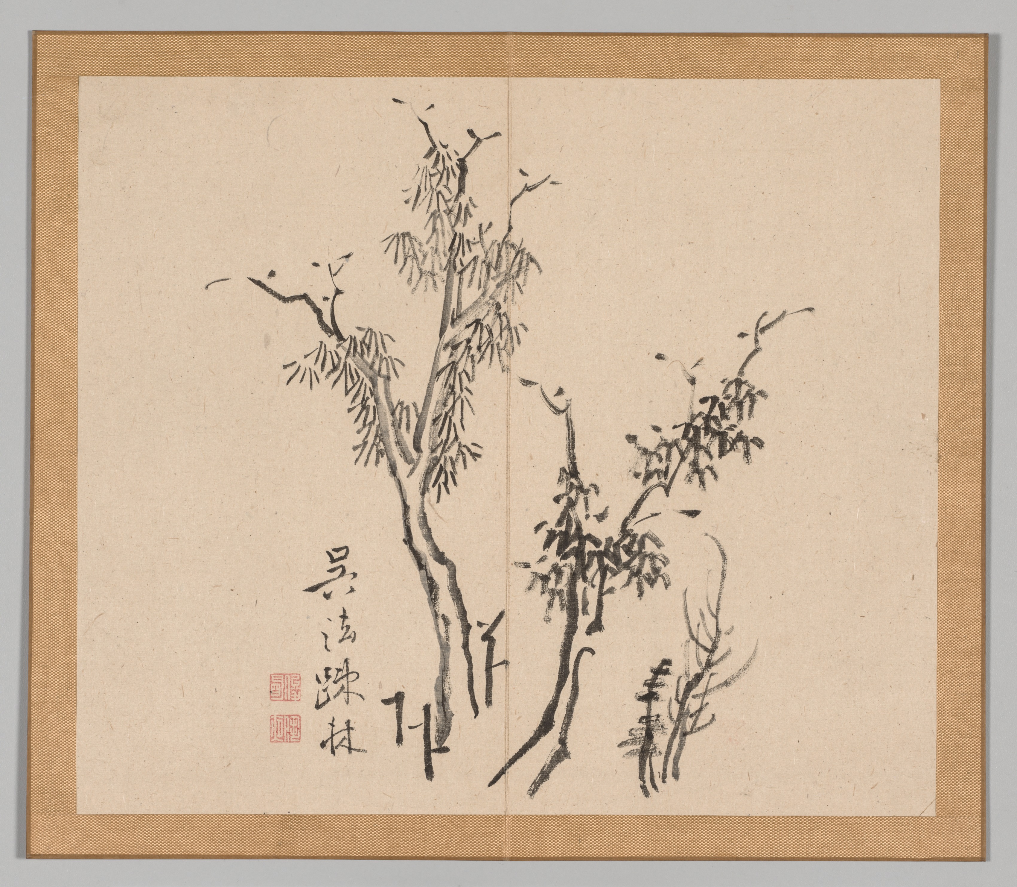 Beige-colored artwork on paper with darker beige border. Black and red Japanese or Chinese-style calligraphy on bottom left. Two red stamps on bottom left. Black ink drawing of tree with hanging branches, resembling a weeping willow, with leaves in center and on right side. Trunk on left is thicker and taller than trunk on right. Tree on right has less leaves and more exposed branches. Small tree or bush on far right. Vertical black line on bottom center. Gray background behind artwork.