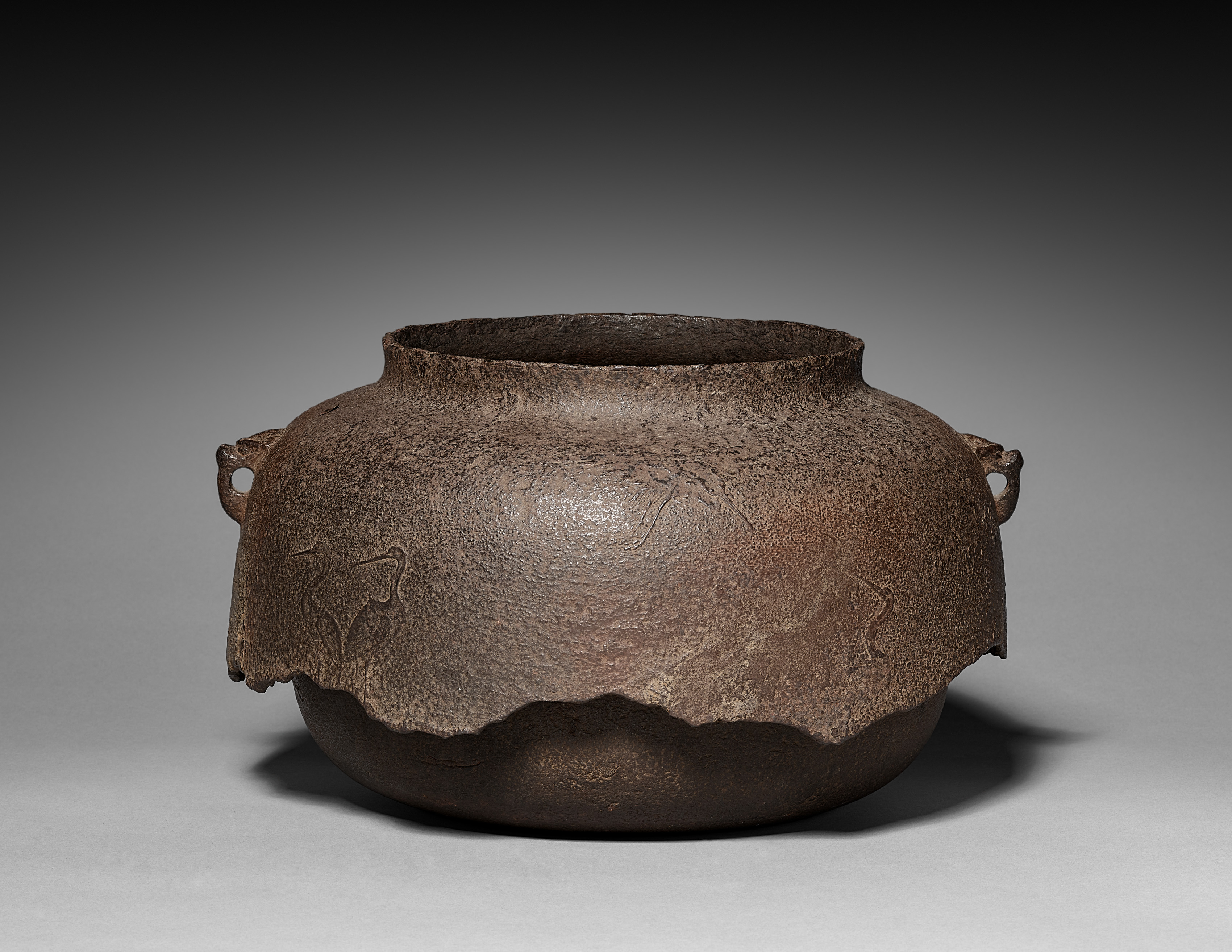 Brown kettle with a crane design. The kettle is made of metal and has a rough texture. It is rounded with a short neck and wide mouth. Two small handles are on either side. The body of the kettle has a design resembling a crane. The bottom edge of the kettle has a wavy pattern. The background is gray, transitioning to black at the top.