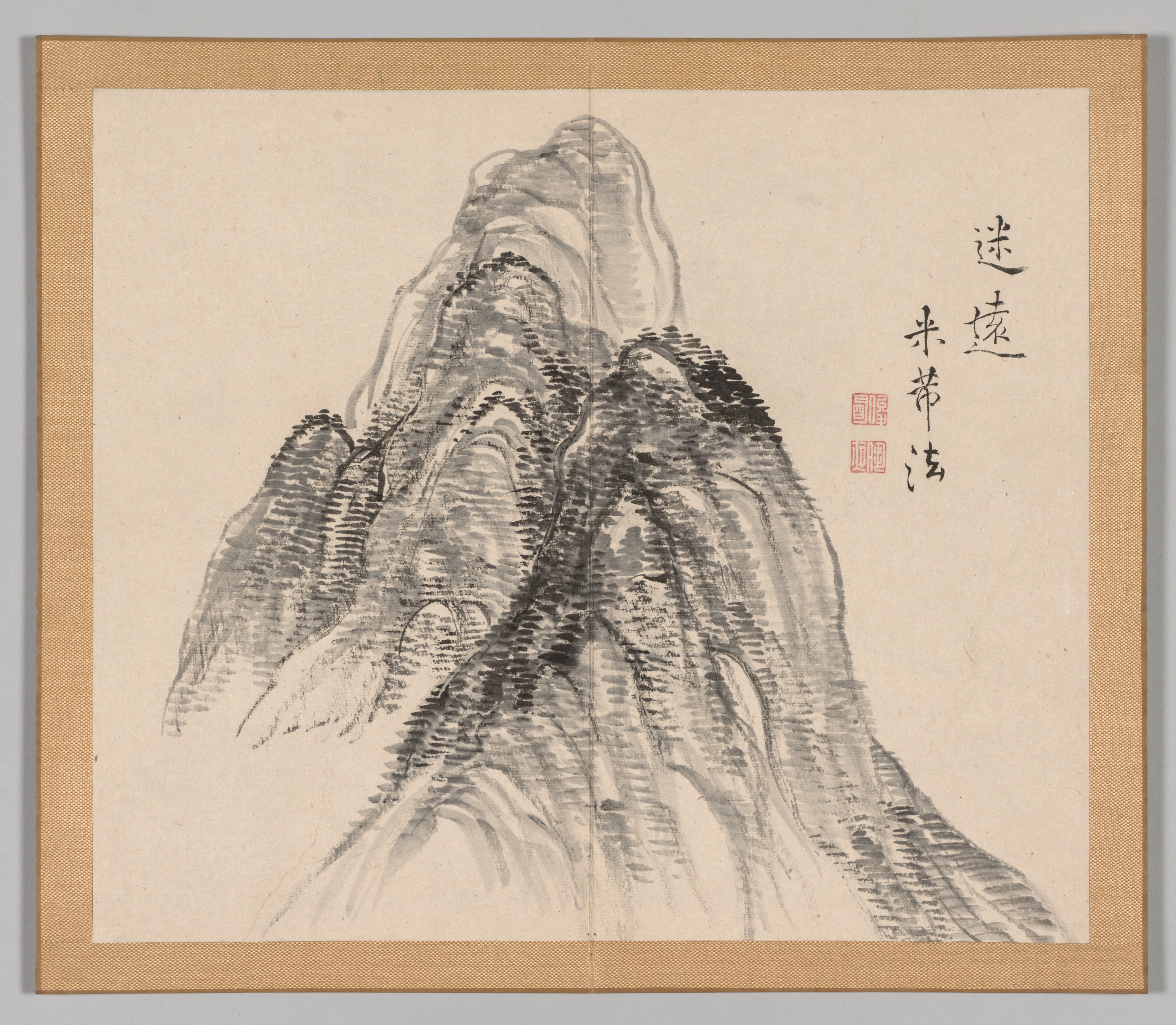 A framed piece of artwork depicting a mountain range in shades of gray and black, with a tan border around the artwork and a light tan background; black and red Asian characters appear on the right side.
