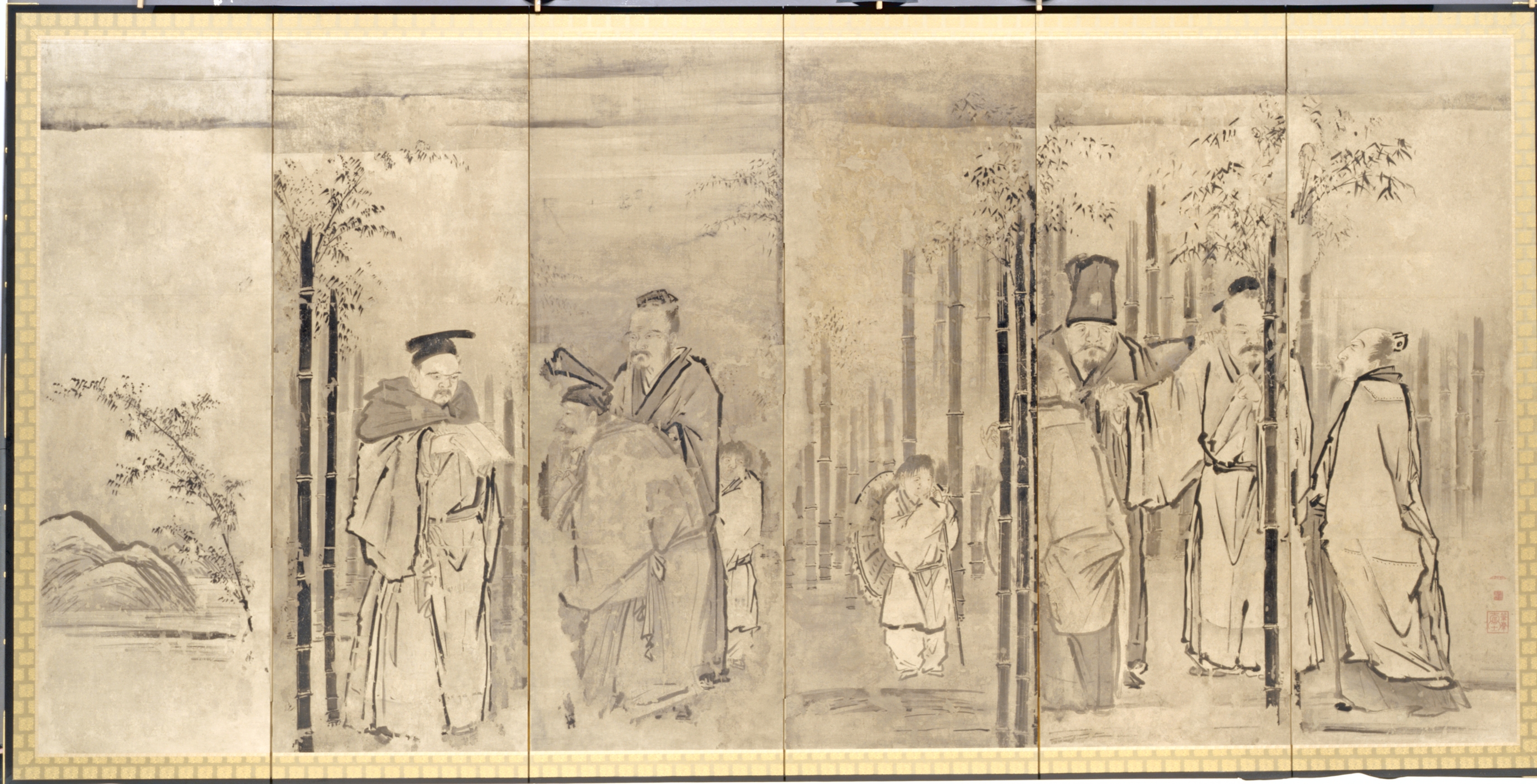 The image depicts a painting of 'Seven Sages of the Bamboo Grove' by Kano Tan’yū. The painting is on a long, rectangular piece of paper or silk divided into six panels. The background shows a landscape with a body of water on the left side and a bamboo forest taking up most of the right side. Seven men, wearing traditional Asian robes and hats, are depicted in a line. The man on the far left wears a hat with a flat top and holds an umbrella. The next man has a long white beard and holds a guqin. The third man from the left appears to be a child. The next three men wear tall hats and hold canes or staffs. The man on the far right wears a conical hat. The painting features muted earth tones. The composition includes vertical bamboo stalks and trees. The men are positioned among the bamboo. The painting's edges have a decorative border. The overall style suggests a traditional East Asian painting. The title and artist are 'Seven Sages of the Bamboo Grove' by Kano Tan’yū.