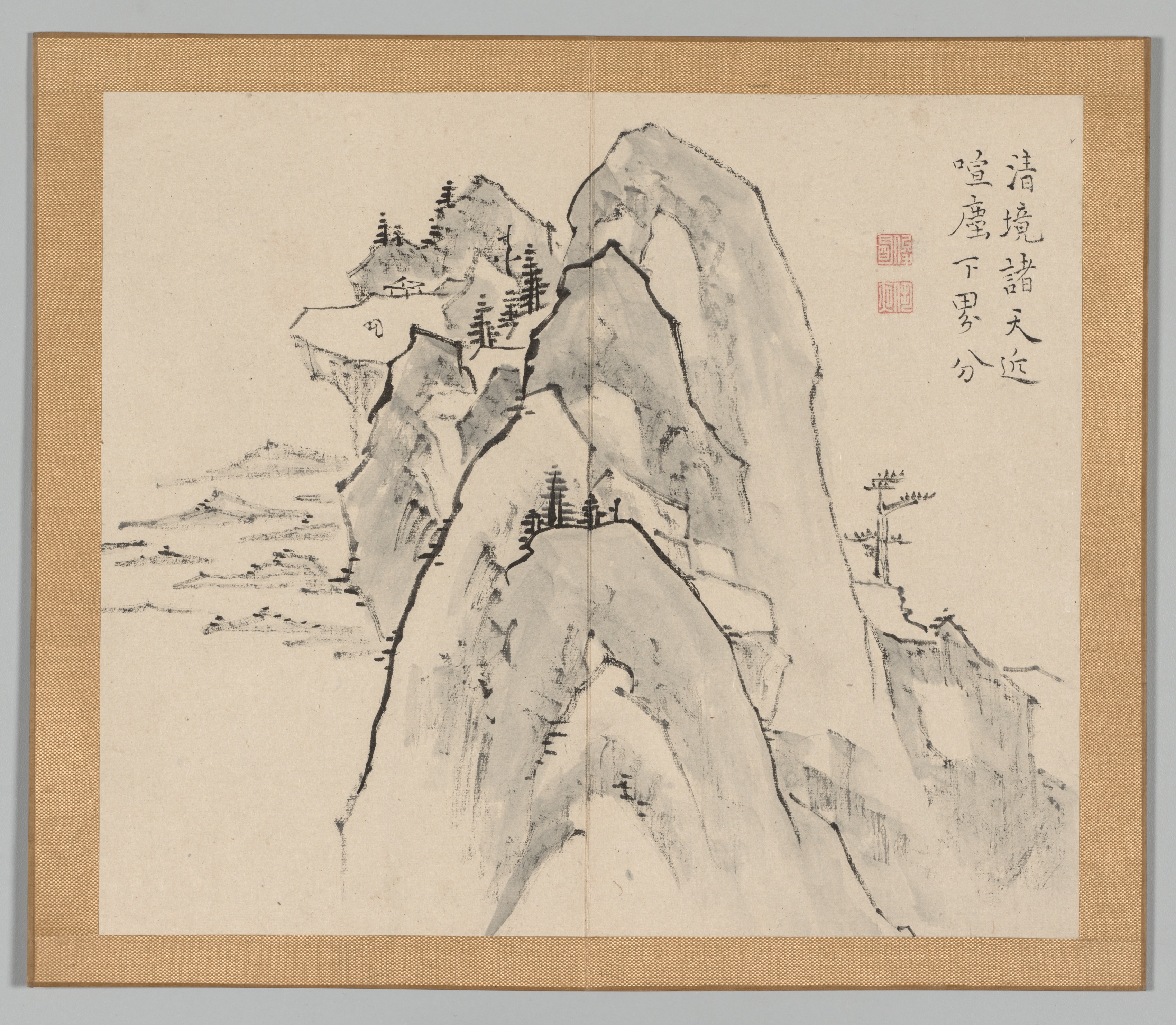The image depicts a painting of a mountain range with trees and buildings. The painting is on a beige background with a brown border. The mountains are painted in shades of gray, with black outlines. There are several trees on the mountains, some of which are on top and some on the sides. There are also buildings on the mountains, one on top of a mountain on the left side and one on a lower level on the same mountain. The mountains are drawn in a traditional Chinese style. The painting also includes some Chinese calligraphy on the right side, written vertically. The calligraphy is in black ink, with two red stamps. The overall composition of the painting is simple yet elegant.