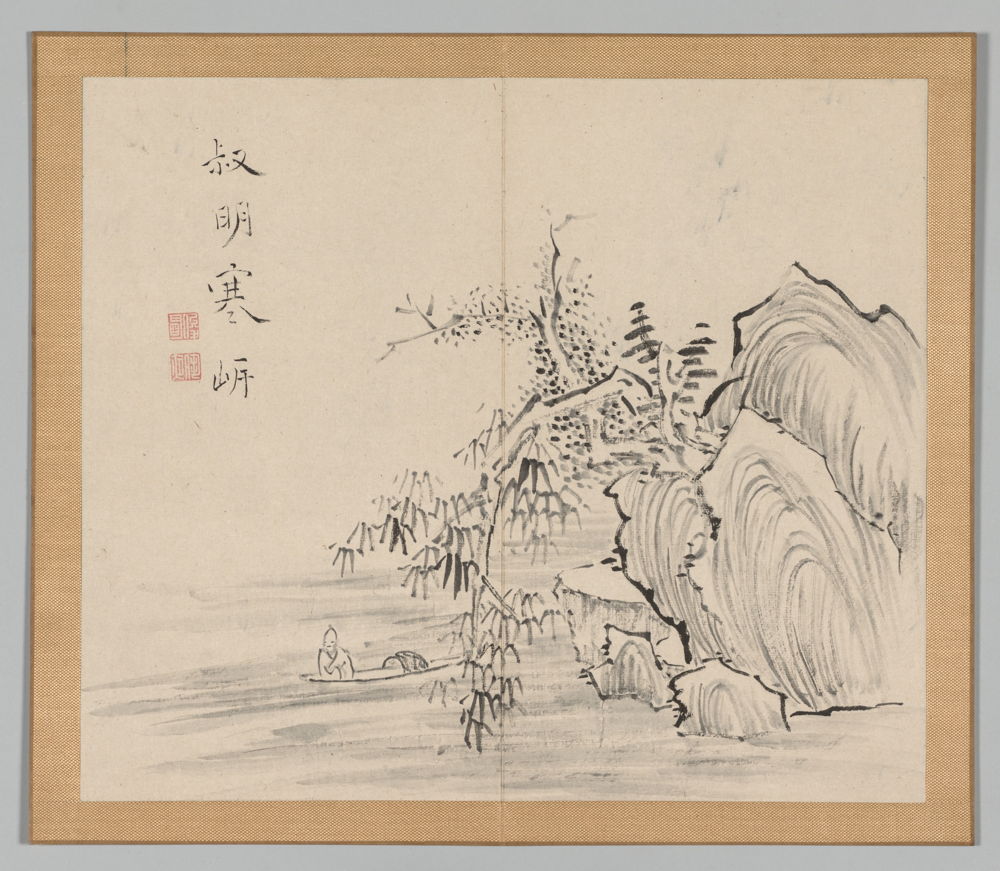 Beige-colored artwork with a brown border, featuring a black and gray landscape drawing on paper. The drawing depicts a large gray and black rocky cliff on the right side, with a tree growing out of it, extending to the left. A body of water is on the left, with a small figure in a boat. Chinese calligraphy in black is on the top left, accompanied by two red stamps below it.