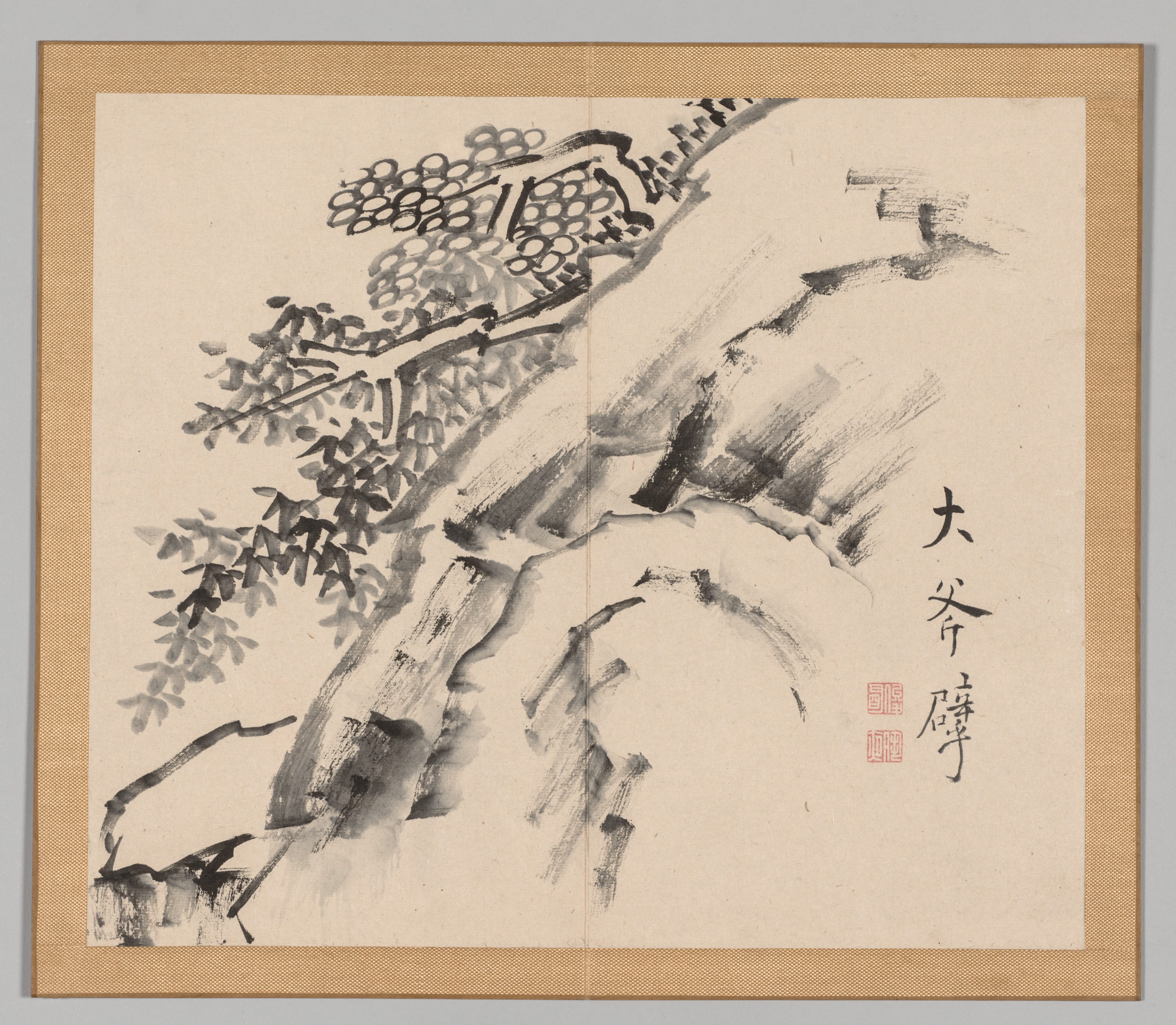 Beige background with brown border. A black and gray painting of a tree branch. The branch runs from bottom-left to top-center. A red seal stamp on bottom-right. More black writing on right.