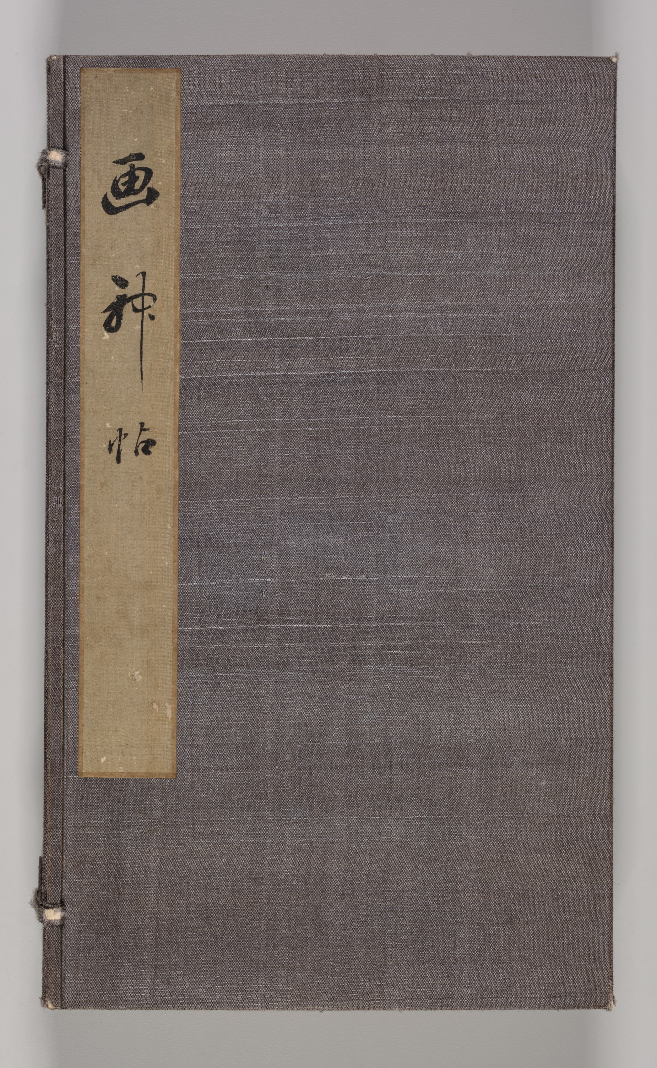 Dark gray book with a textured cover, small white spots on the cover, and a vertical tan strip on the left side with black Japanese characters. The book is rectangular. The tan strip is on the left side. The book has a dark gray binding on the left edge with two small pieces of white material visible. The background behind the book is light gray. The title appears to be written in black on the tan strip.