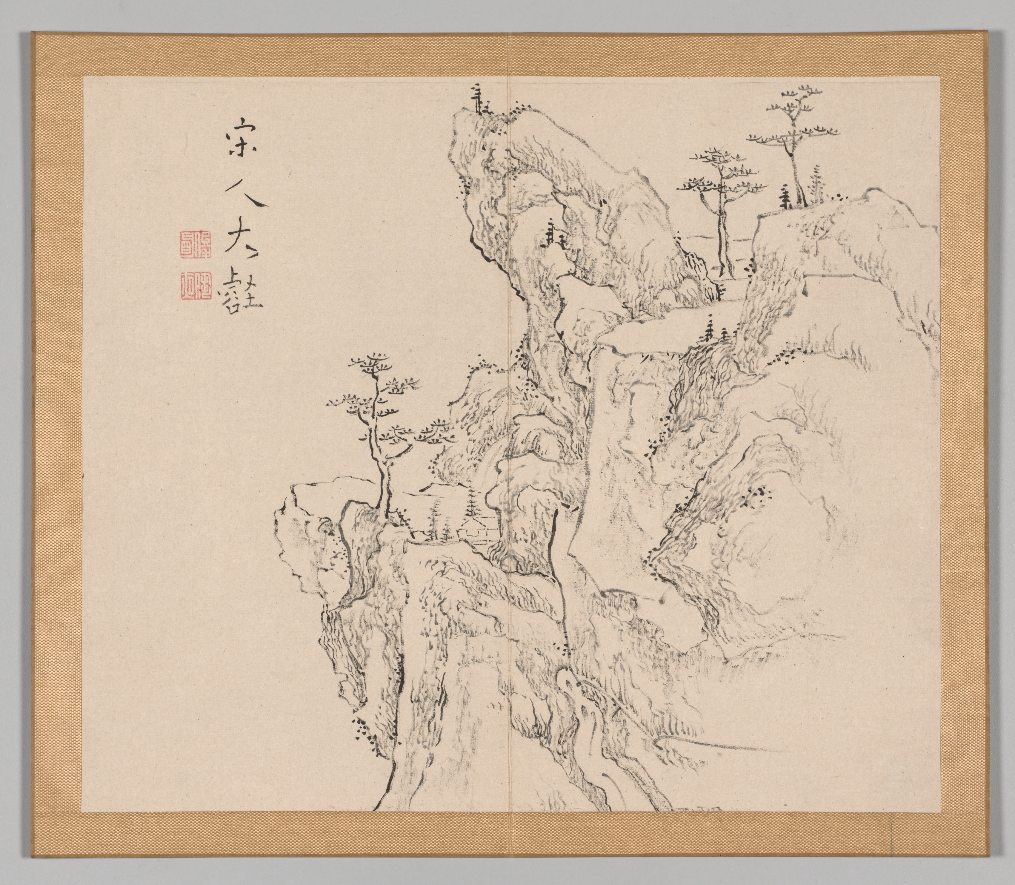Beige-colored artwork with a tan border; a landscape drawing of a mountain and cliff face; ink on paper; black and white; some trees; Asian calligraphy on the left side; two red seals; centered on a gray background.