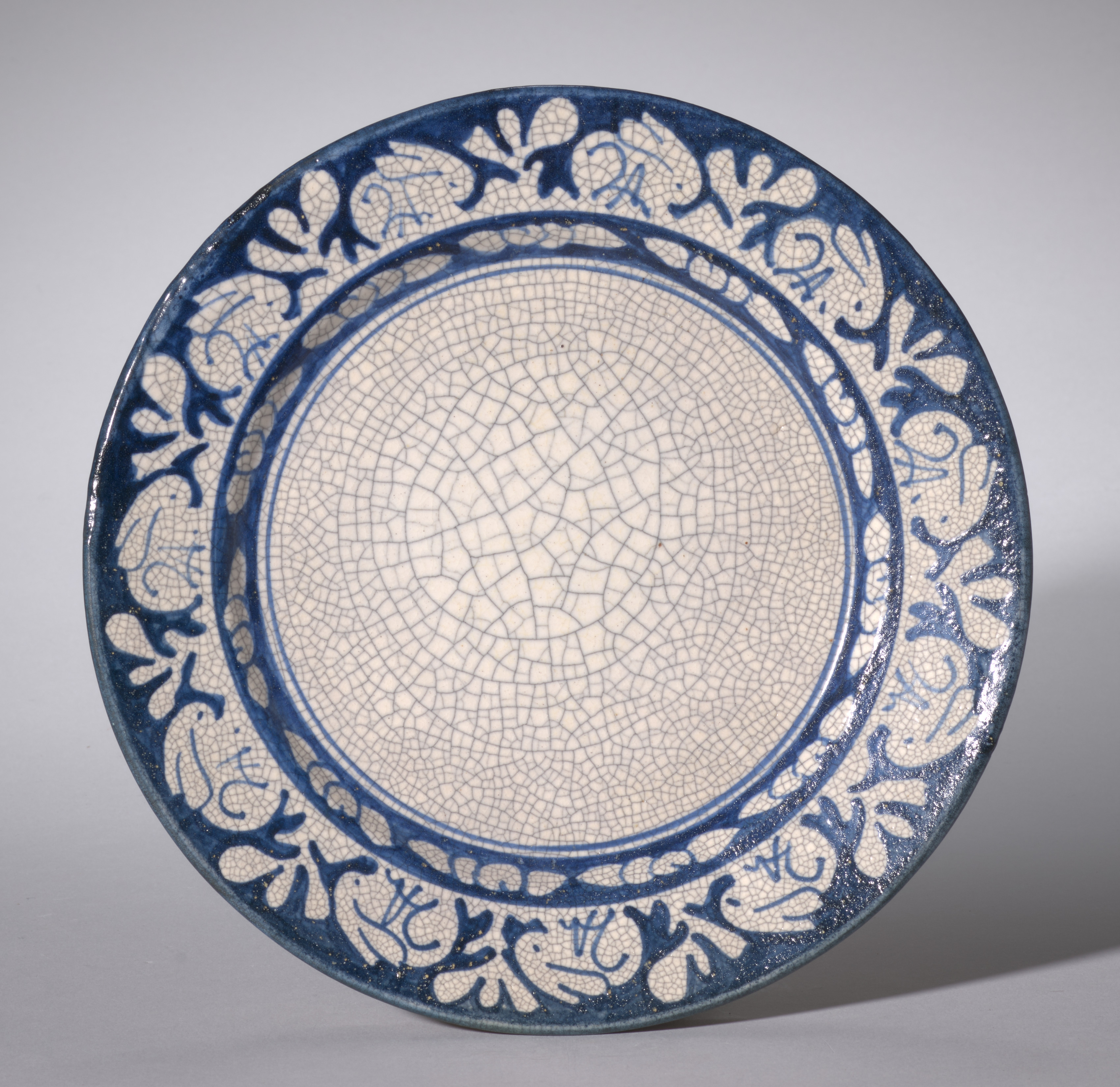 Small Plate by Dedham Pottery. The plate is round with a wide rim. The plate has a blue and white design. The center of the plate is white with a cracked pattern. The rim of the plate is blue with a white floral design. The floral design consists of leaves and flowers. The plate has a glossy finish. The plate casts a shadow on a grey surface. The background is a gradient grey.
