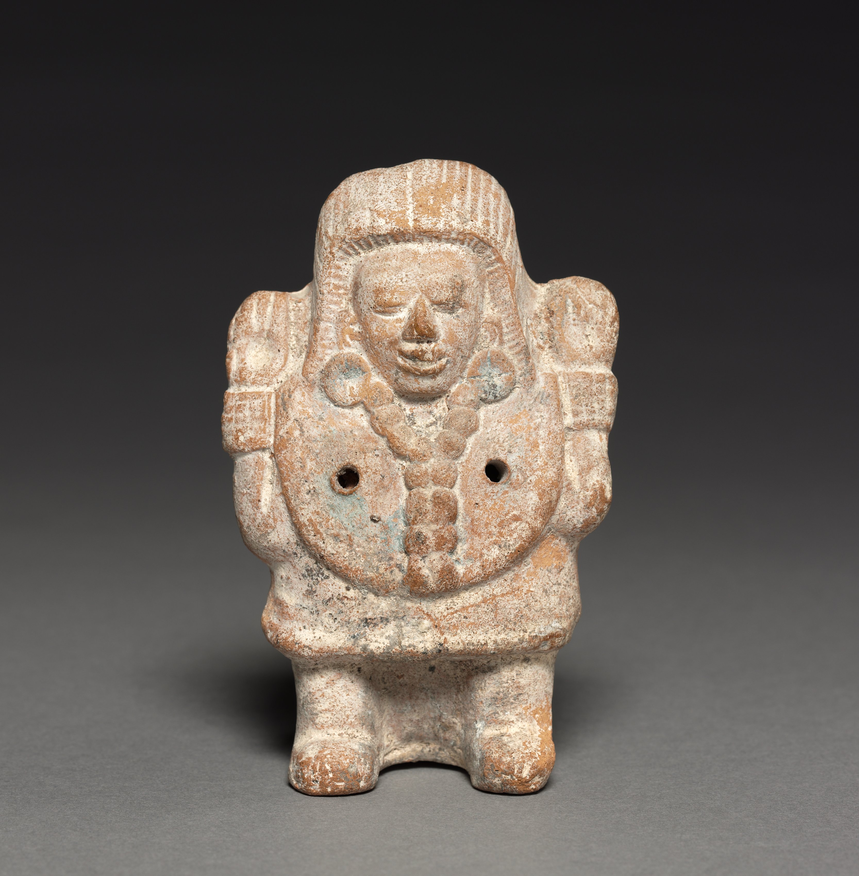 The Female Figurine Rattle by the artist depicts a small, stone statue with a light brown and beige coloration. The statue features a woman with long hair wearing a necklace and earrings. Two holes are visible on her chest. She has her arms raised, and her hands are clenched into fists. The statue has a rough texture and appears to be made of stone or ceramic material. The background of the image is dark gray, which helps to highlight the details of the statue. Overall, the image presents a detailed and intricate representation of an ancient female figurine, showcasing its unique features and craftsmanship.