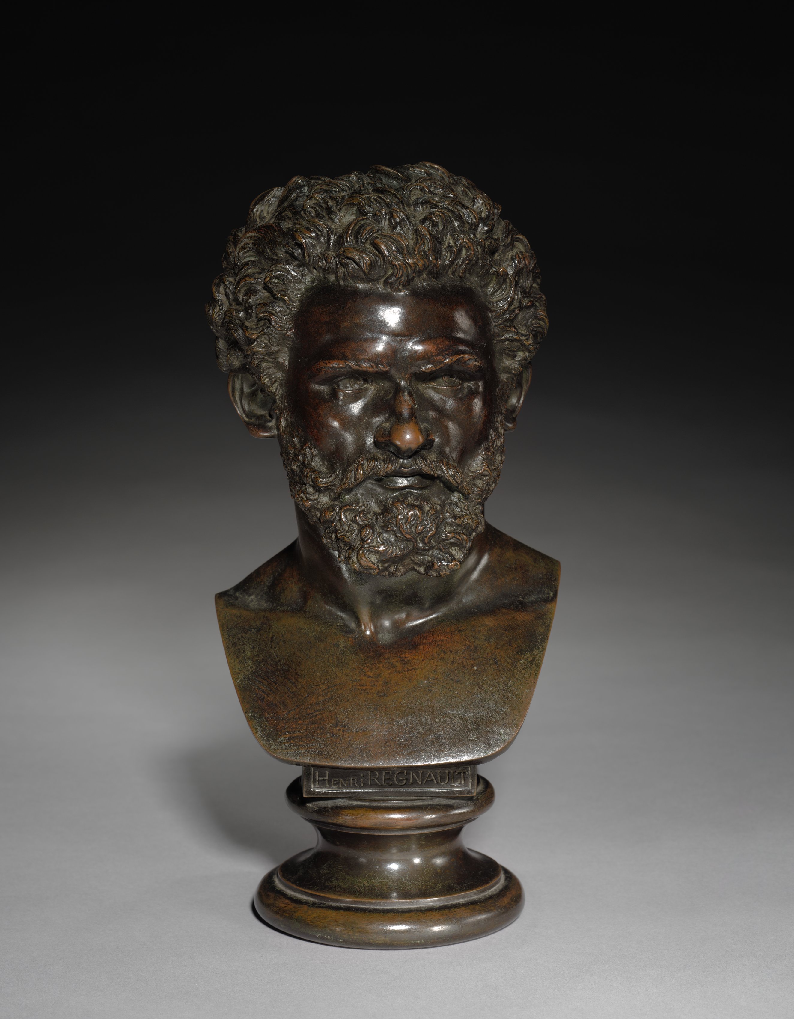 Dark brown bust sculpture on a short pedestal with a dark to light gray gradient background. The sculpture depicts a man with curly hair and a thick beard. The pedestal has a wide base that narrows before widening again to support the bust. A small plate on the front reads 'Henri Regnault'.