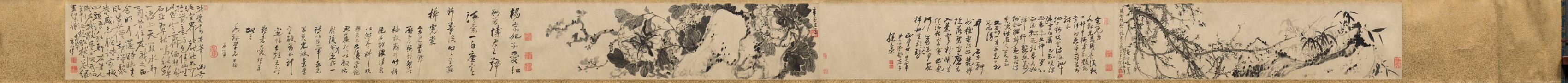 Horizontal Chinese scroll painting on beige paper with darker edges. The scroll contains black and red calligraphy in two large blocks on the left and center right. The left block of calligraphy consists of 19 lines of text. The right block consists of 11 lines. Both blocks contain red seals. There are two landscape paintings on the scroll: The left painting depicts blossoming tree branches with a white or light-colored background. The right painting depicts trees with a figure standing among them. The trees are mostly bare-branched with a few clusters of leaves. The figure wears a hat with a long, dark robe and holds an object. The background of the painting shows mountains with a few structures. Red seals are present throughout both paintings. The scroll has an even darker border on the right edge.