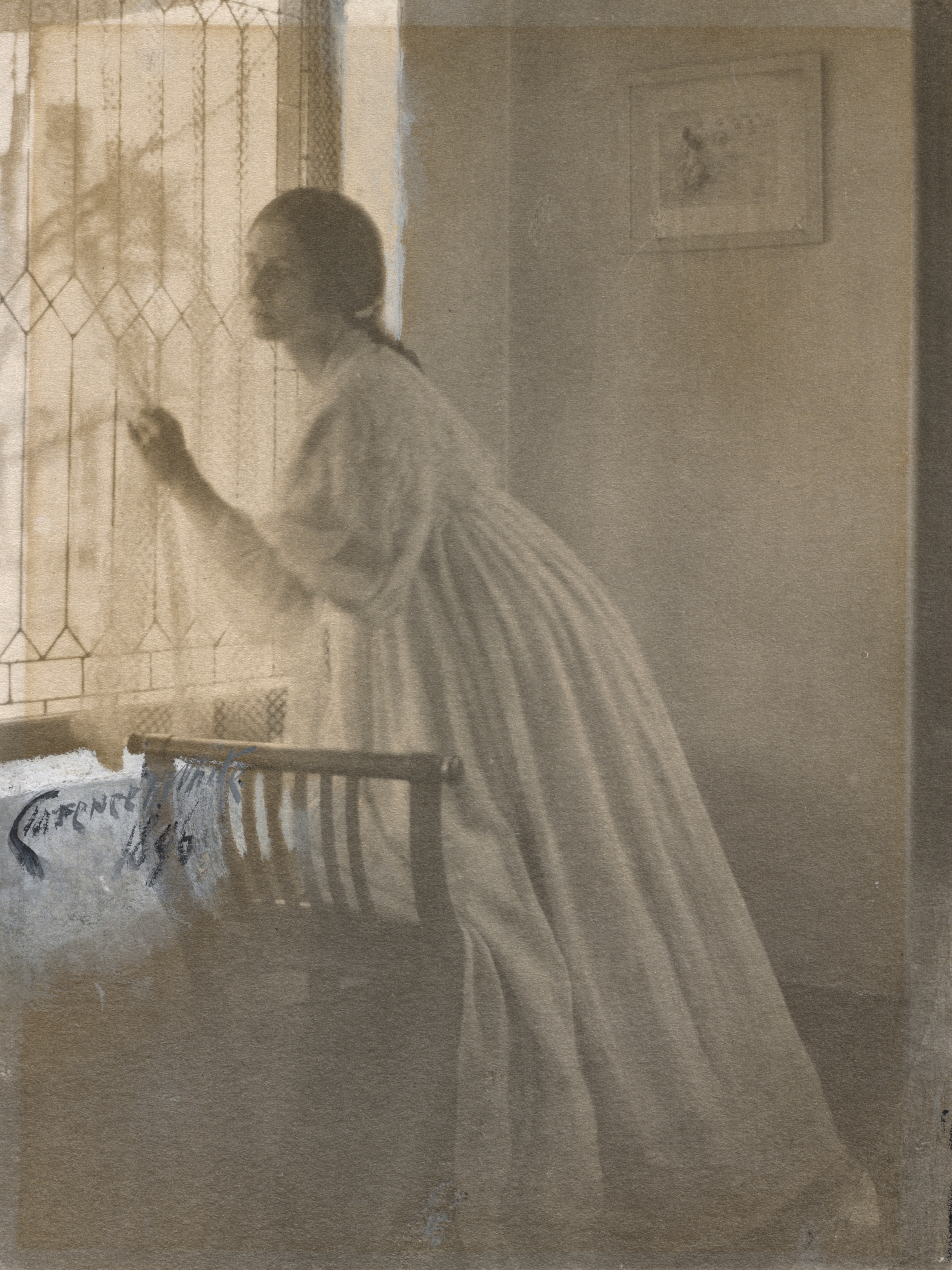 A woman in a long dress standing by a window with a curtain and a chair next to her. The woman is wearing a long-sleeved dress and has her hair pulled back into a low ponytail or braid. She is standing facing left, looking out the window and touching the curtain with her right hand. The curtain has a diamond-shaped pattern. A wooden chair with a white cushion is partially visible in front of her. On the wall behind her is a framed picture. The room appears to have light-colored walls. The image is sepia-toned.