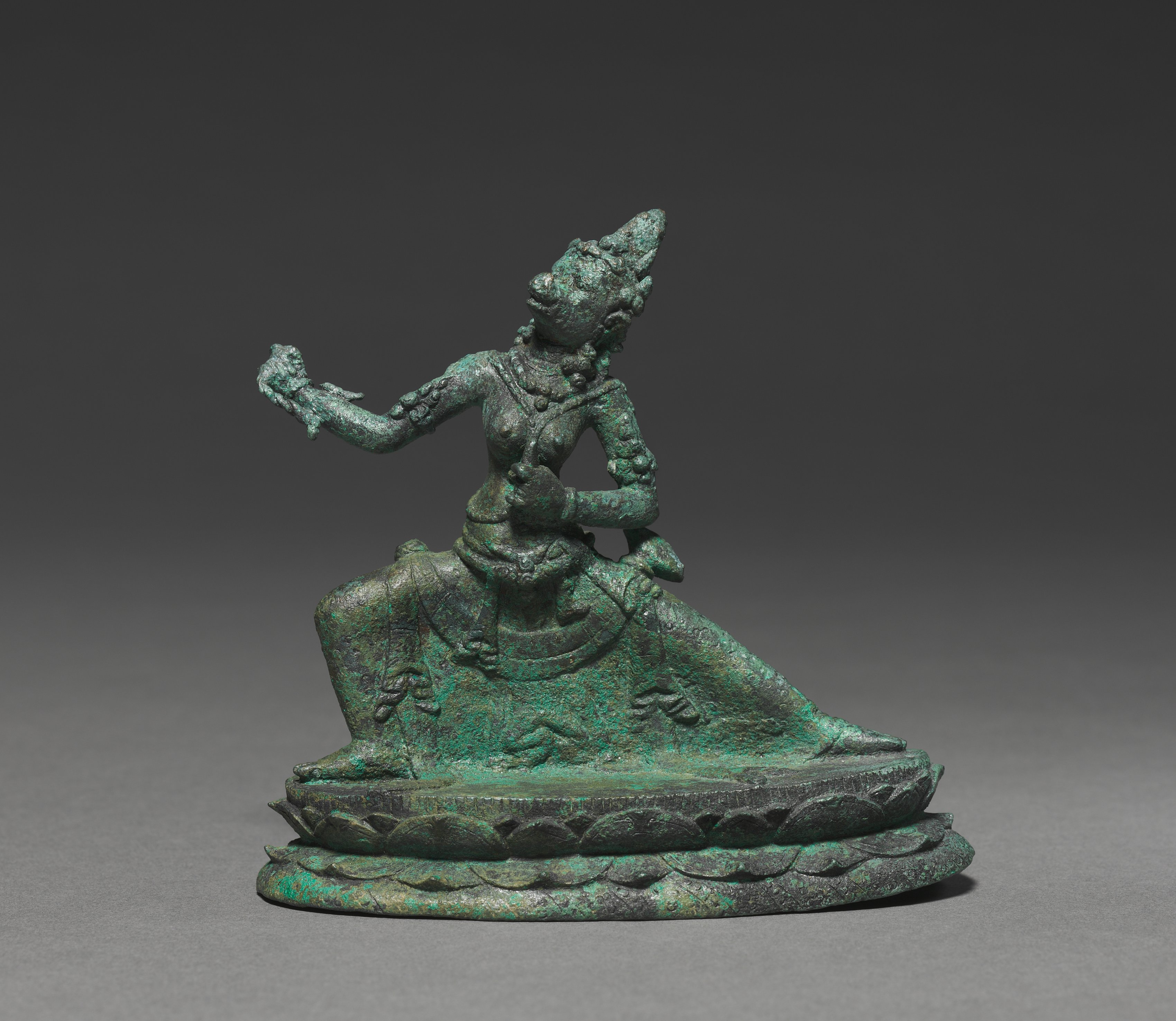 Green-patinated bronze sculpture of Varahi, a Hindu goddess, sitting on a lotus flower base. The sculpture depicts Varahi with a boar's head wearing a tall crown. She sits on her right leg and has her left leg bent in front with her left foot resting on a lotus flower. Her left arm rests on her left knee and her right arm extends outward. The sculpture has a two-layer base adorned with a petal design. The background is a gradient transitioning from dark gray at the top to light gray at the bottom.