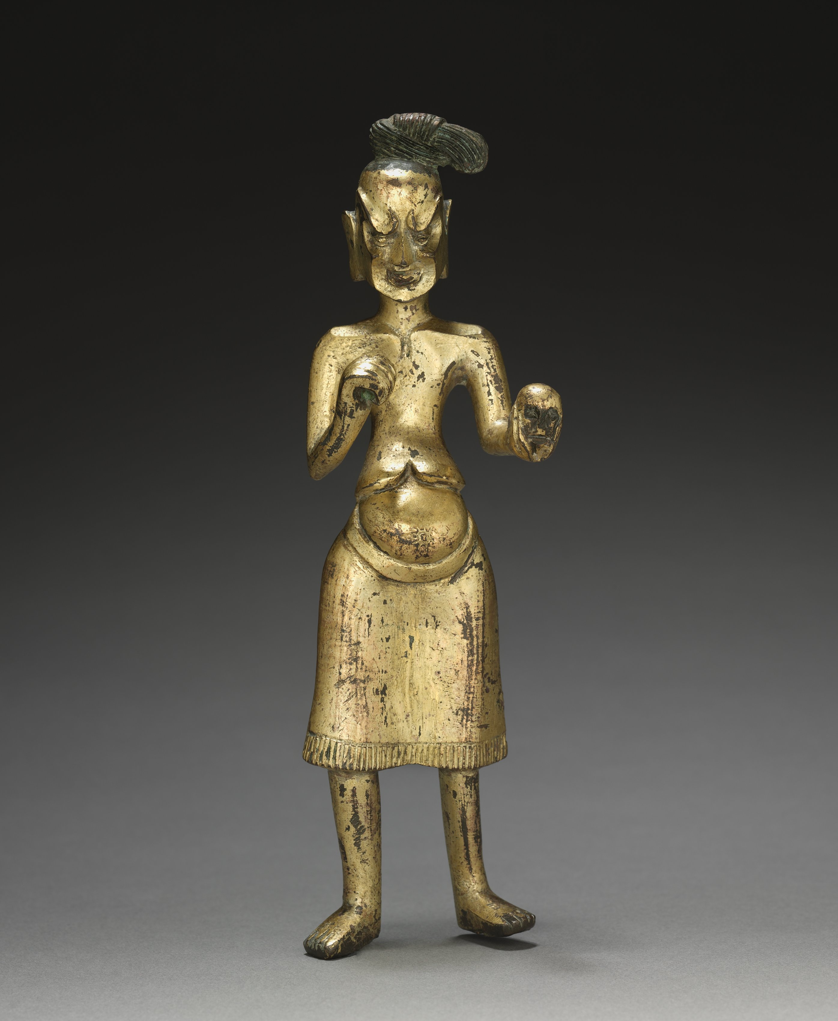 The image depicts the "Ascetic Holding a Skull" by an unknown artist. The figure is a gold statue with a weathered appearance, showing signs of aging. The statue stands on two feet, with the weight shifted slightly onto the right leg. The left leg is slightly bent. The figure wears a short, fringed skirt. The upper body is bare. The figure has a distinctive hairstyle that appears to be styled upwards. The left hand holds a skull. The right hand is positioned near the chest. The background is dark at the top, transitioning to light gray at the bottom.