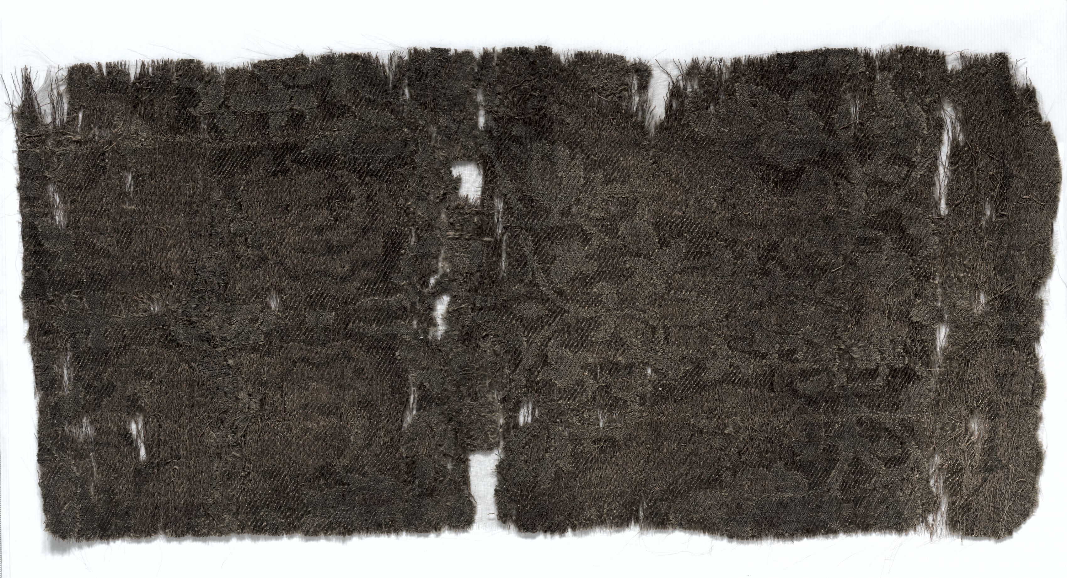Dark brown rectangular piece of fabric with frayed edges, Silk Fragment by Anni Albers.