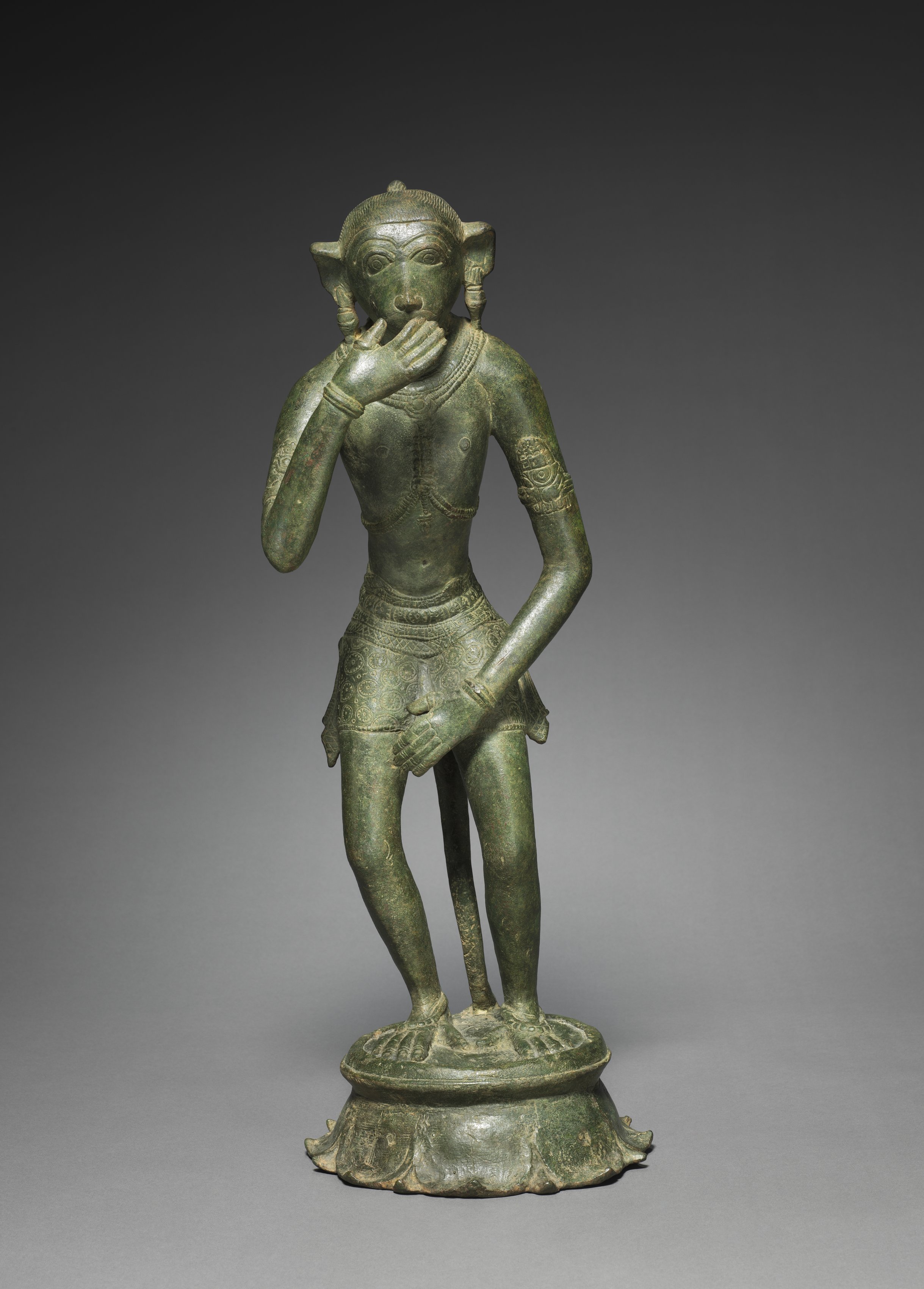 The image shows a bronze statue of Monkey General Hanuman, standing on a circular base. The statue is green with a darker patina and depicts a humanoid monkey figure with large pointed ears. The figure is wearing a short skirt and a necklace. The figure has one hand raised to its mouth and the other resting on its hip. The figure has a short top knot on its head. The figure is standing with its weight on its right leg, and its left leg is slightly bent. The base of the statue is decorated with a leaf-like design and has a scalloped edge. The background is a gradient from dark gray at the top to light gray at the bottom.