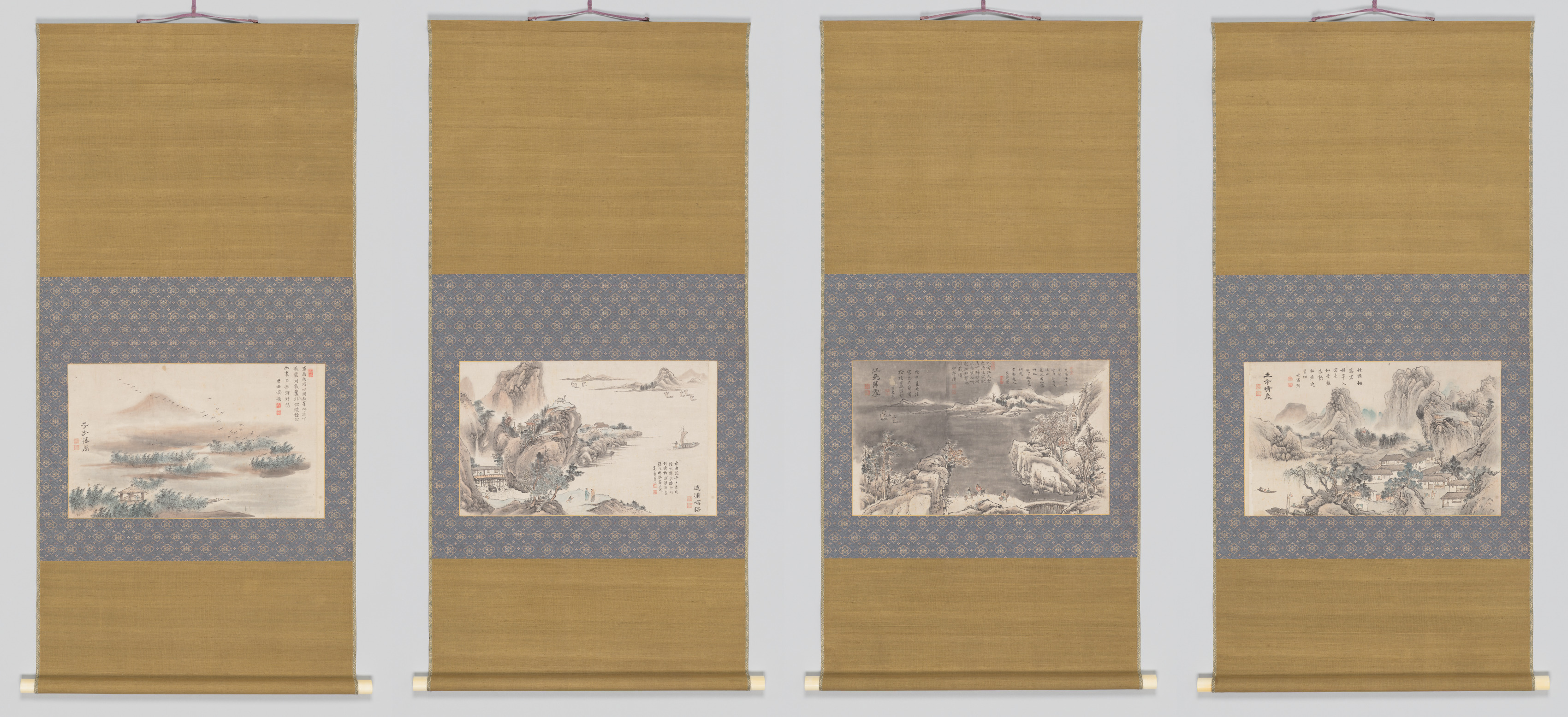 Four long, narrow, golden-brown scrolls with a blue patterned band across the middle. The top and bottom of each scroll are plain golden-brown. The blue patterned band on each scroll contains a landscape painting. The paintings are in black and white. The leftmost painting depicts a mountain and a body of water. The second painting from the left shows a rocky shoreline. The third painting from the left features a body of water with a distant building. The rightmost painting shows a mountainous landscape. Chinese characters are written in the top-left corner of each painting. The scrolls are hanging from a thin metal bar. The scrolls have a small golden rod at the bottom. The background is light gray. The artist is Tani Bunchō and the title is "Four Motifs from the Eight Views of Xiao-Xiang".