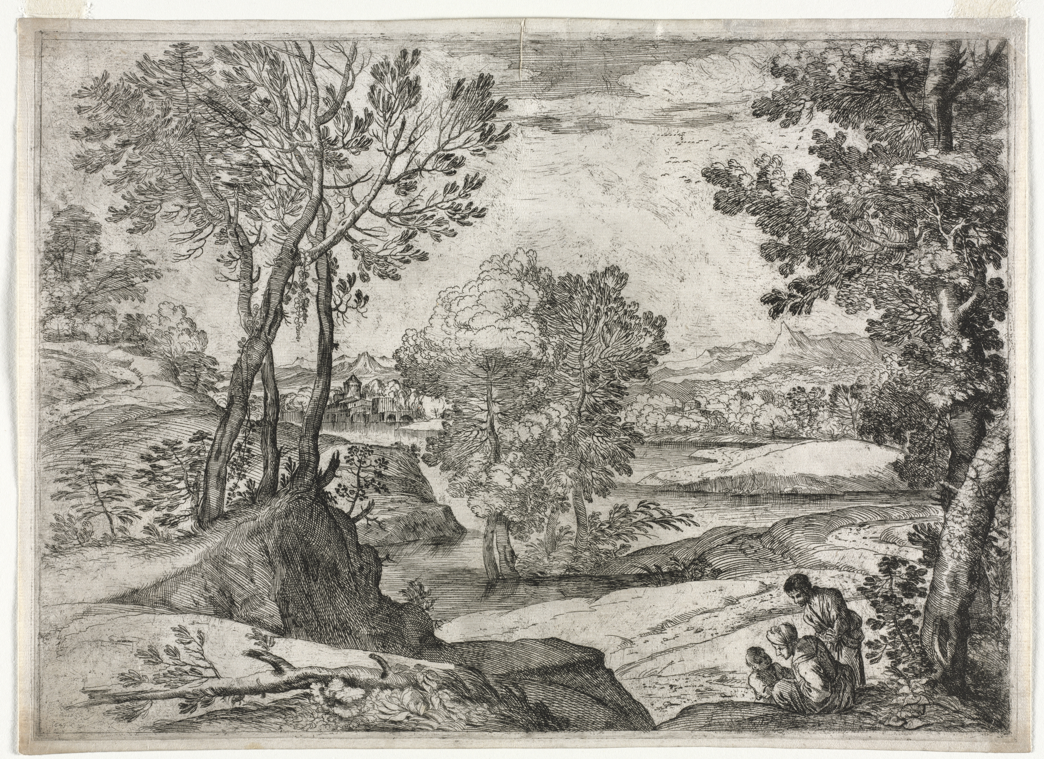 Landscape with a family by Giovanni Francesco Grimaldi. The image is a black and white drawing of a landscape. There are trees on the left and right sides. In the foreground on the right are three people sitting on a rocky outcropping. The people are wearing old-fashioned clothing. Behind them is a body of water. In the background are more trees, hills, and mountains. The sky has clouds.