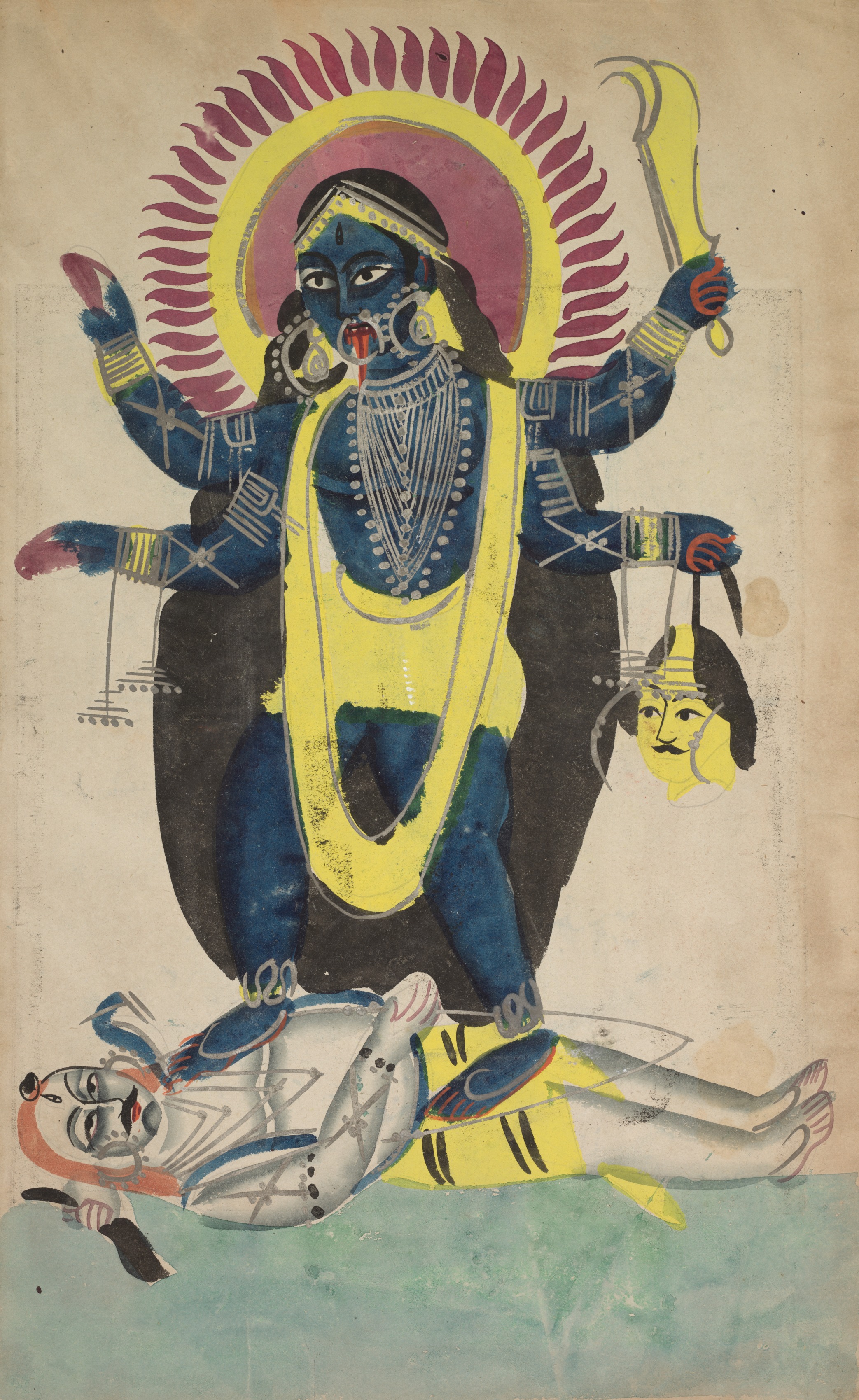 Leaf from a Kalighat album: The Goddess Kali (recto); Kali Standing on Shiva (verso)
