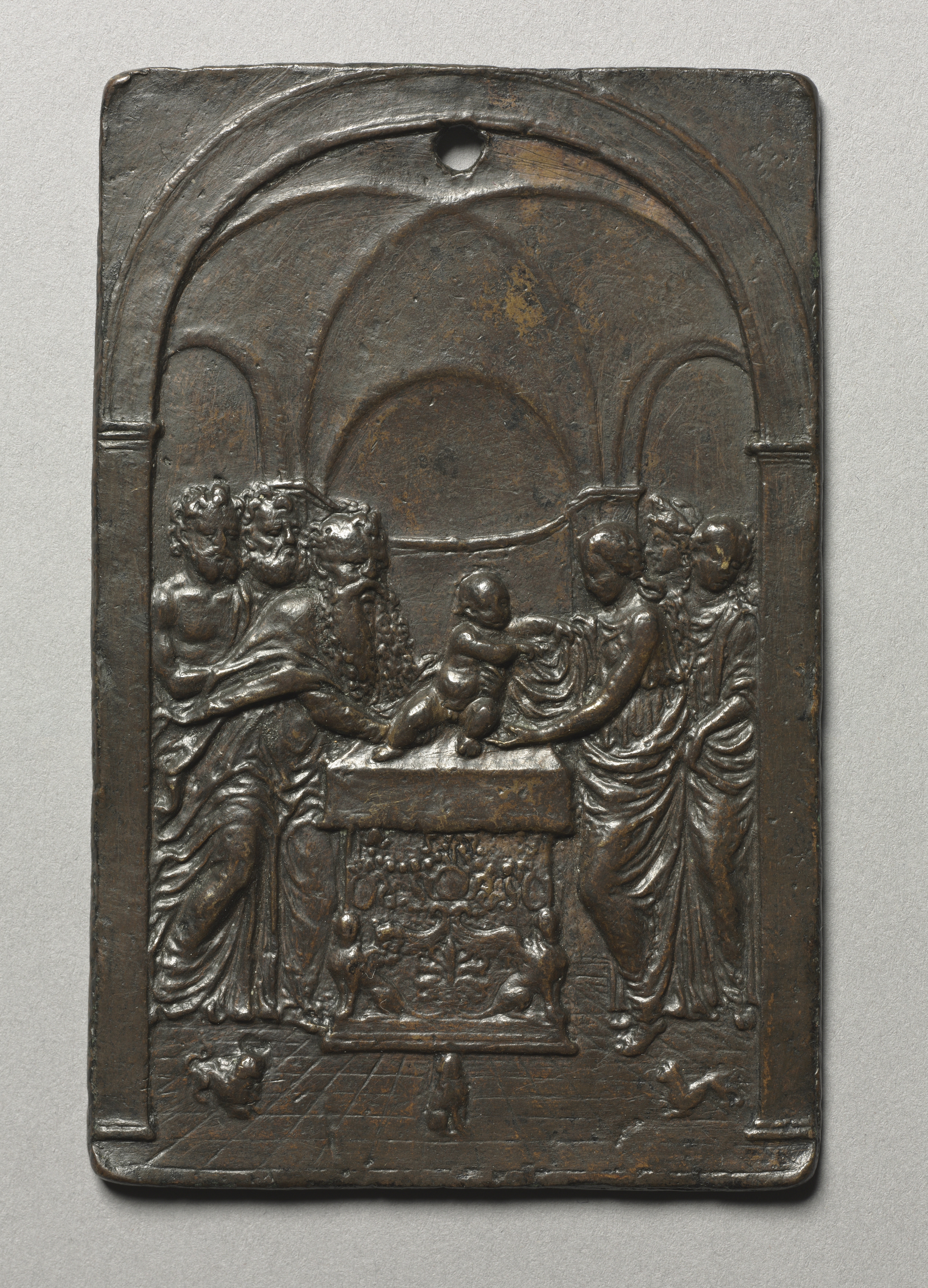 The image depicts a rectangular, bronze plaque with rounded corners featuring a relief sculpture. The plaque shows a scene with a large archway in the background and a semi-circular archway behind the figures. The scene depicts a group of people gathered around a table or altar. There are two individuals on the left side, two on the right, and one in the center. The central figure is a baby being held over the table. The individuals are wearing drapery-style clothing. The table has a decorative front. The plaque has a small hole at the top center. The background of the image is a light gray color. This is "Presentation in the Temple" by Moderno.