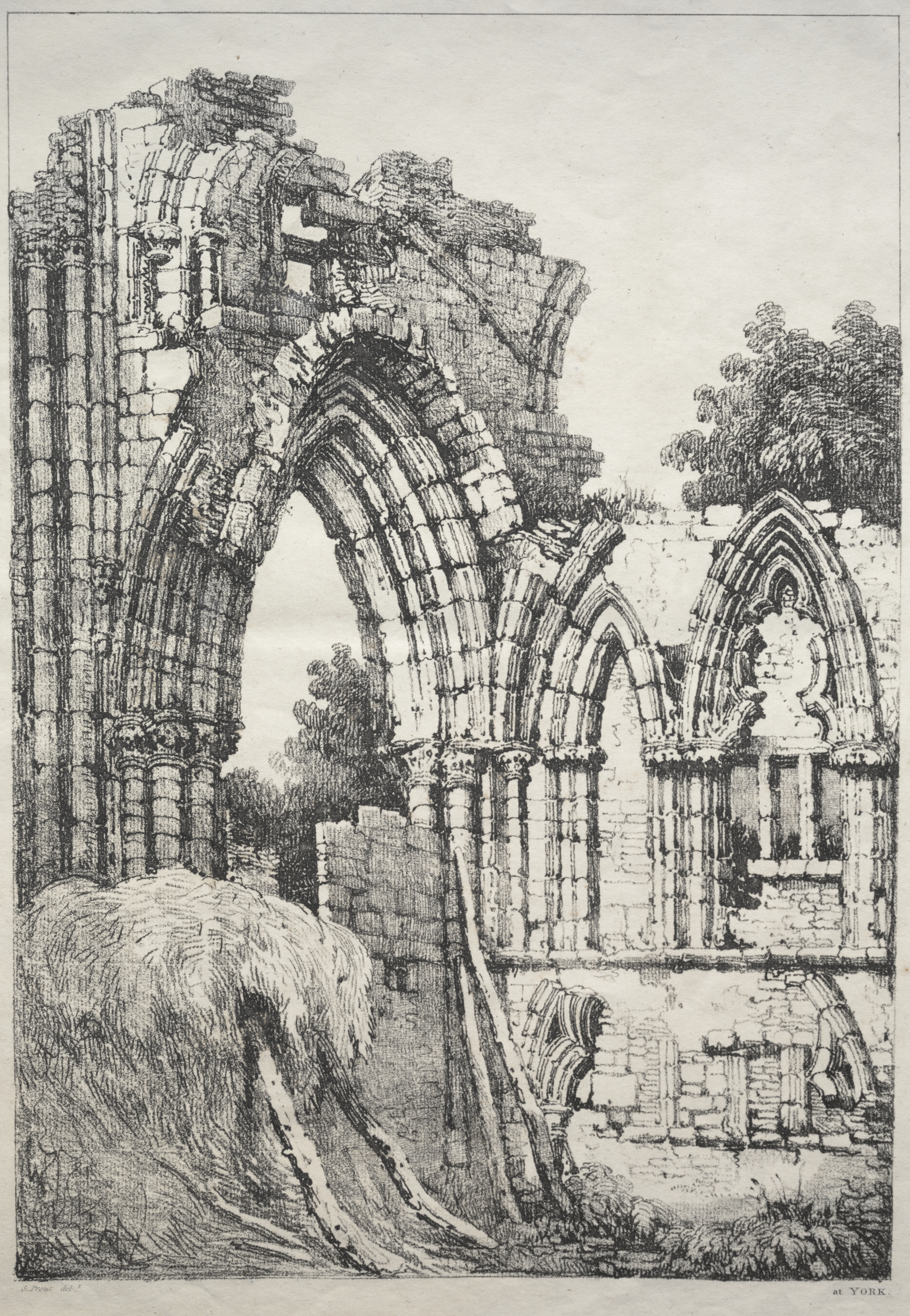 Black and white drawing of stone building ruins. Large pointed archway in center, with another archway to right. Trees in background. A pile of hay in foreground to left. Sky visible through archways and above ruins.