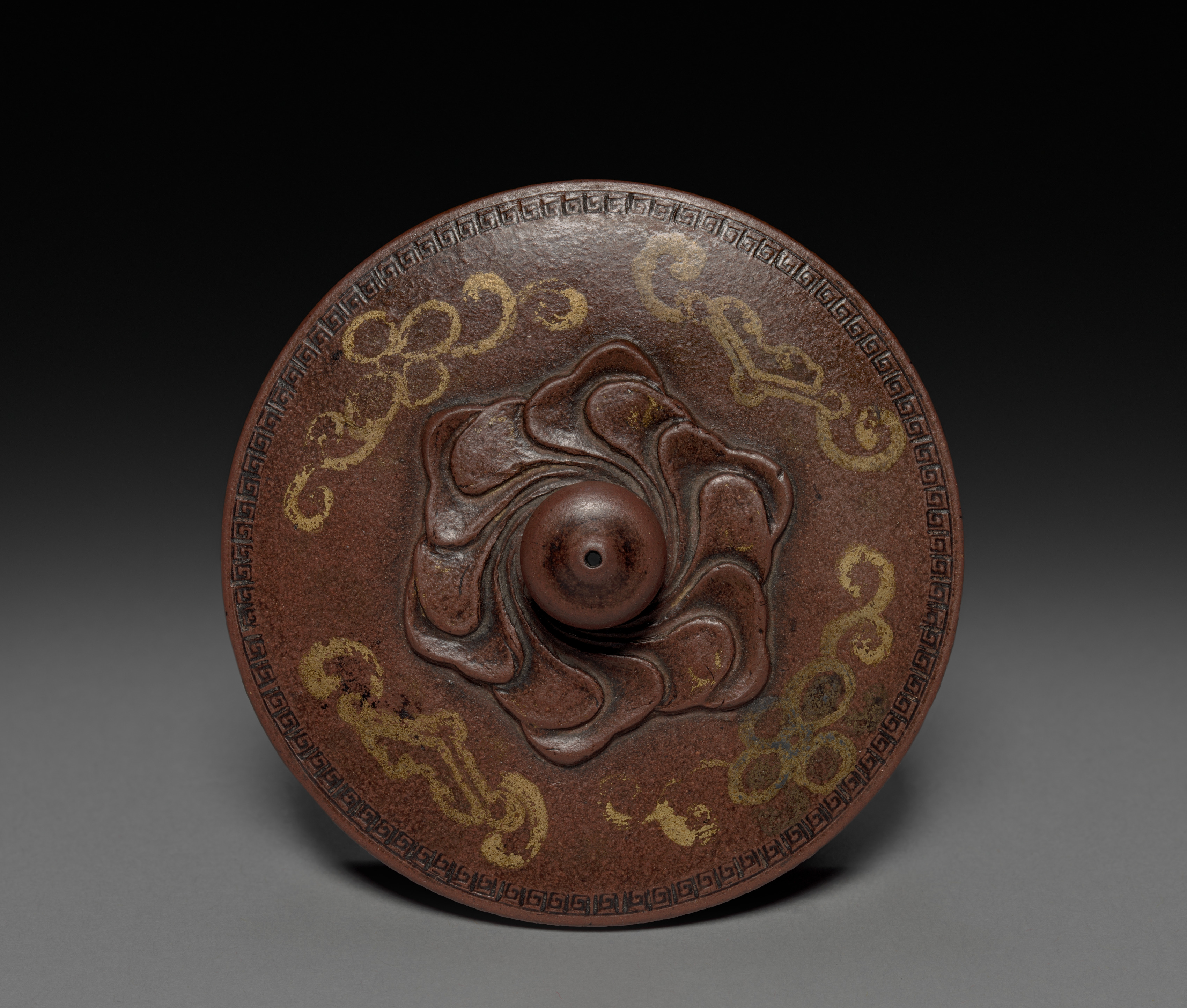 Brown teapot lid with a raised floral design and gold accents. The lid is circular with a small circular knob in the center. The knob is surrounded by raised, wavy petals resembling a flower. The lid has a border of small, interlocking squares. Gold swirling patterns are etched into the lid on either side of the flower. The background of the image is dark gray to black, with the lid casting a shadow. The overall style and design are characteristic of traditional Chinese art. The teapot lid is by Chen Hanwen and features a landscape and imperial poem.