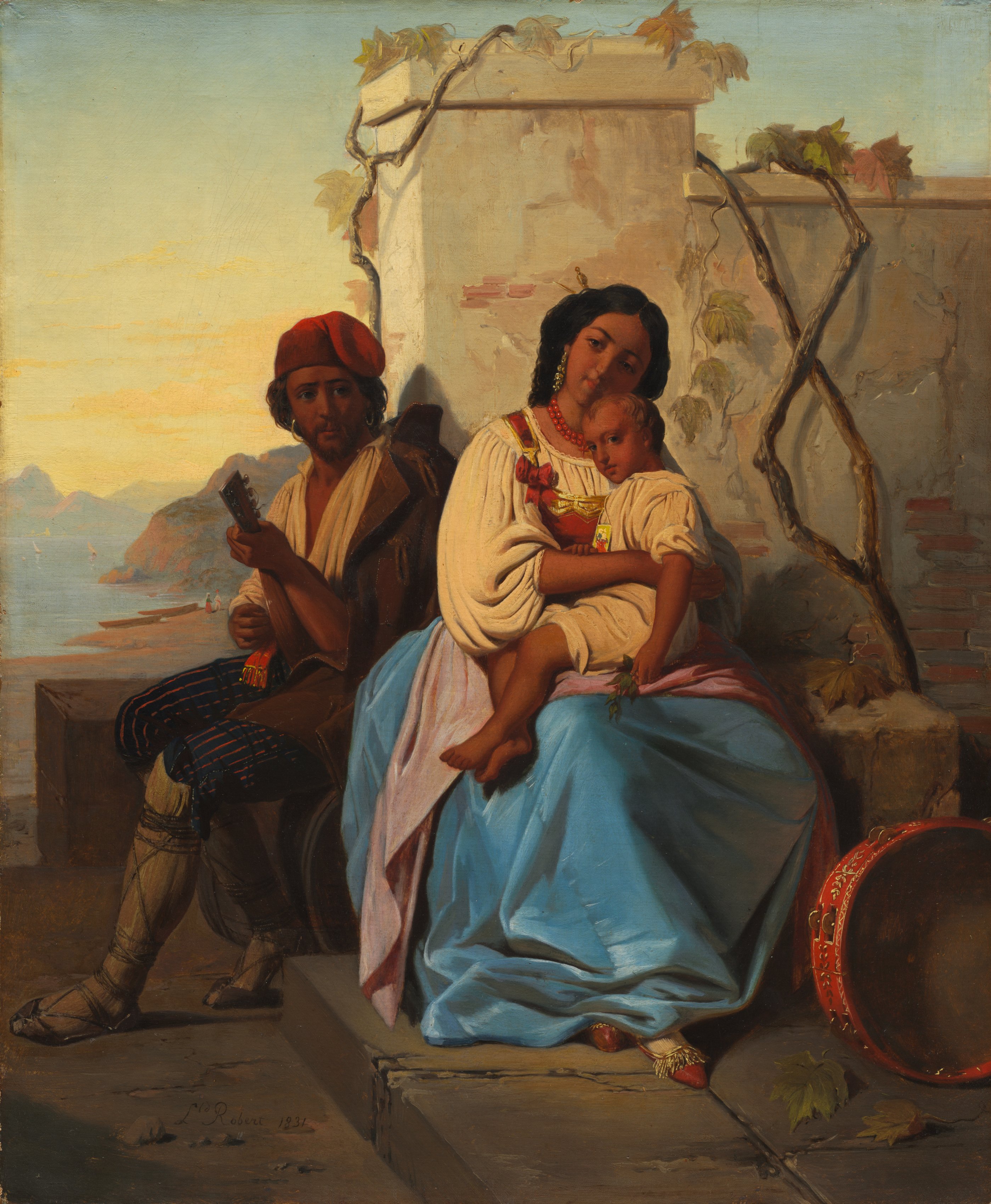 The painting depicts a serene scene with two people and a baby. The man on the left sits cross-legged on a low platform, wearing a red head covering, a white shirt with billowy sleeves, a dark jacket with gold trim on the shoulder, and striped pants; his right hand holds a stringed instrument. The woman on the right sits on a step with her right leg bent and right foot on the step; she wears a white billowy-sleeved top adorned with red trim and jewelry around her neck, and a blue skirt; she holds a baby with a white top. The background features a body of water with a mountain range on the horizon to the left and a stone wall with vines growing up it to the right. The wall is in the foreground on the right; a large drum sits on the ground beside the woman. The sky transitions from yellow on the horizon to blue at the top. The scene titled "Italian Scene" by Léopold Robert presents an intimate moment.