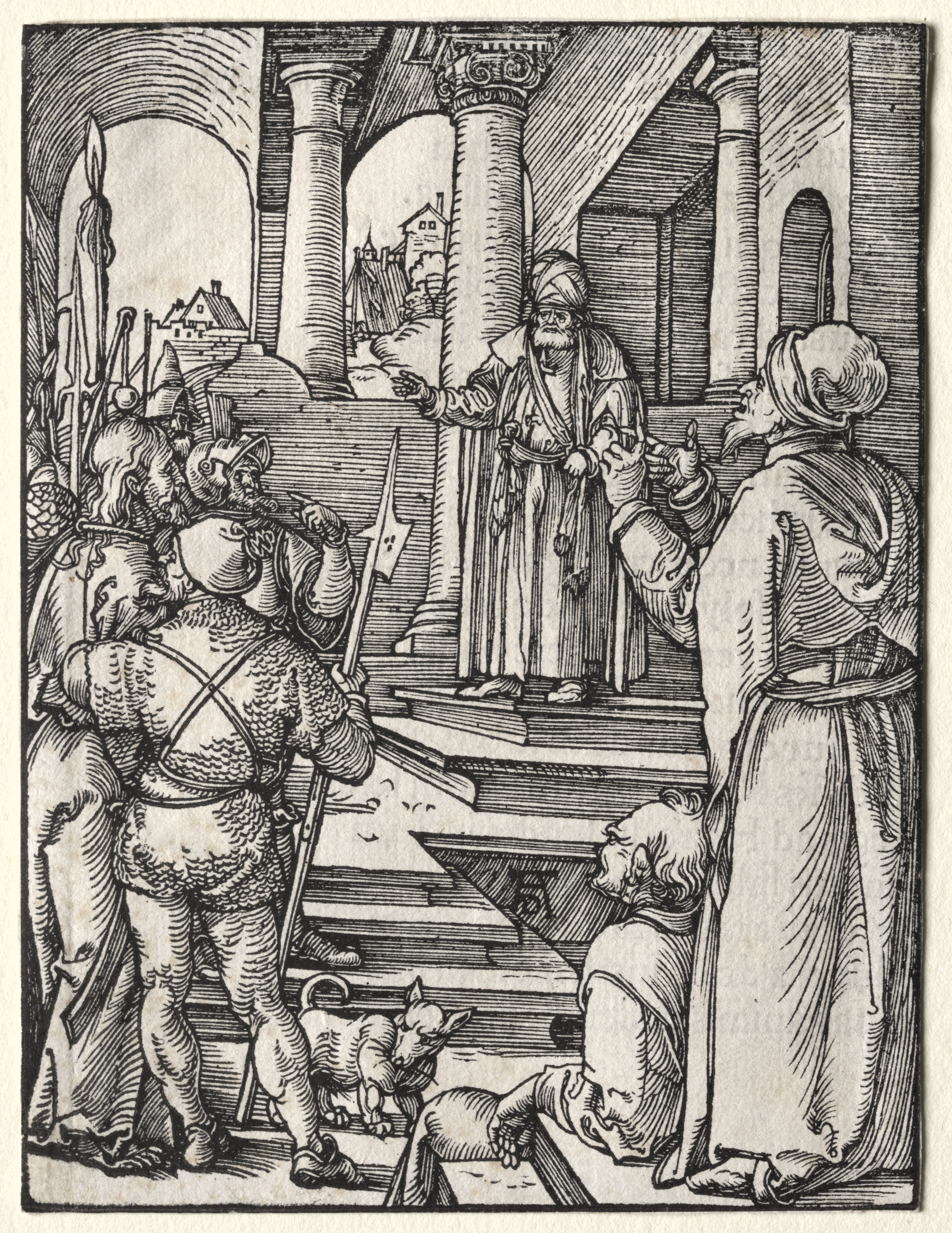 Black and white engraving of a man standing on steps, wearing a long robe and head covering, with one arm outstretched. He stands facing right. A group of people surrounds him on the steps and on the ground. Some wear armor and carry spears. One on the right wears a long robe. A dog is on the steps. There are columns and arches in the background, and buildings can be seen in the distance.