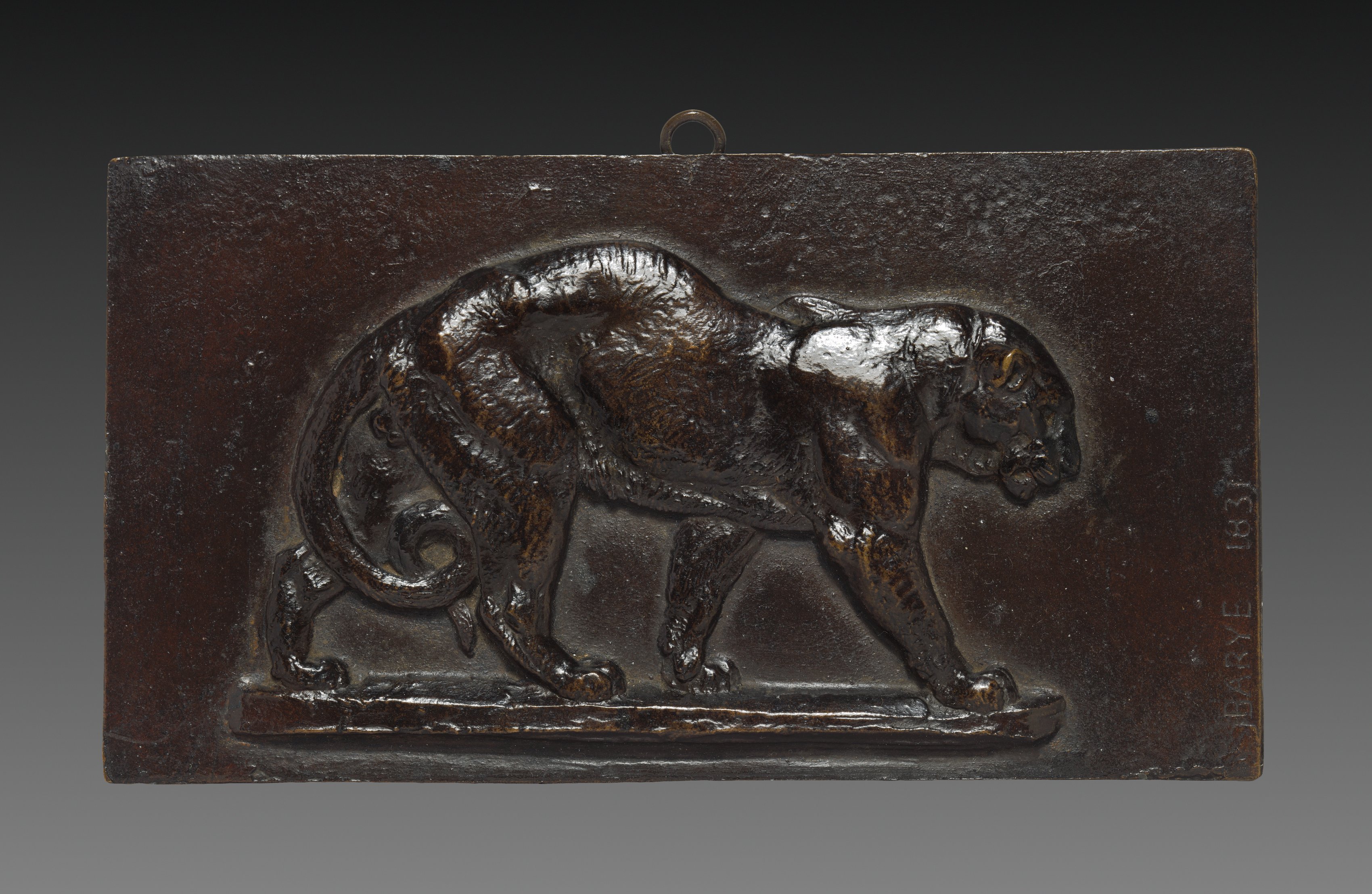 Dark brown rectangular metal plaque with a raised panther design. The panther faces right, body low and stretched out, head down, front right leg extended forward, back left leg extended back. The panther's tail curls under and touches the back left leg. A small loop is at the top center for hanging. The artist's signature is on the right side.