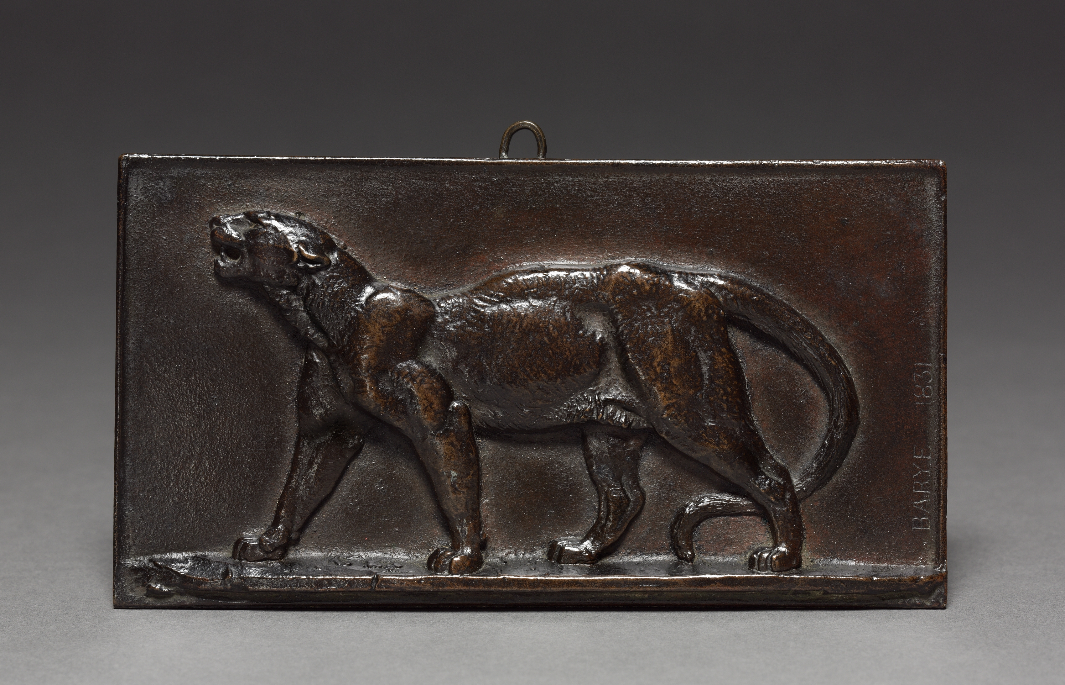 Dark brown rectangular bronze plaque with a raised relief image of a leopard walking to the left, mouth open. The leopard's body is in a side view, with its front left leg and back right leg visible. The plaque has a small loop at the top for hanging. The artist's signature "BARYE 1831" is engraved on the right side. The background is a gradient of dark gray to light gray.
