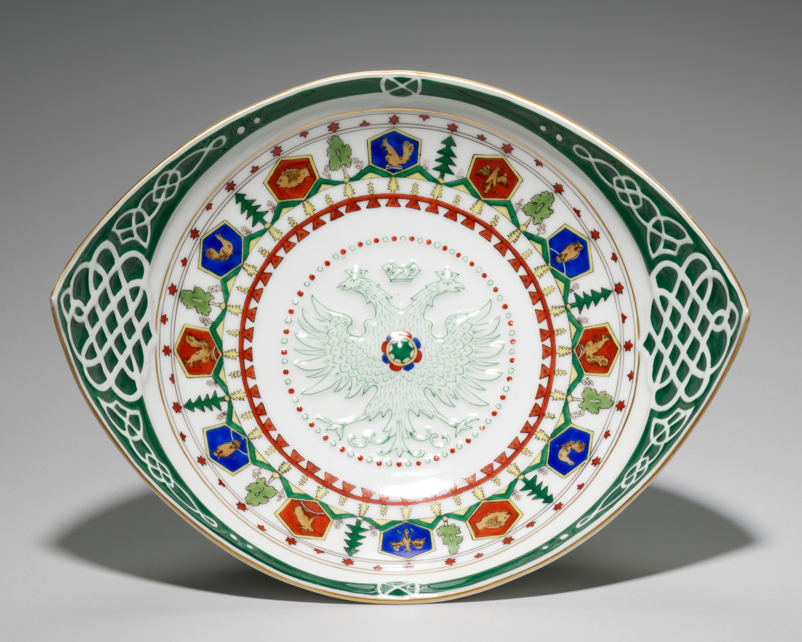 Bowl by Kornilov Brothers. The bowl has a white base. The interior features a green double-headed eagle at the center, surrounded by a red ring with triangular motifs and a series of small yellow dots on either side. The eagle has wings spread and a colorful shield on its chest. Further out, there are alternating red and blue hexagons with gold designs, separated by green trees. The rim of the bowl is green with white interlocking oval shapes and a gold trim along the edge. The bowl has a rounded, wide shape. It sits on a gray background with a shadow underneath.
