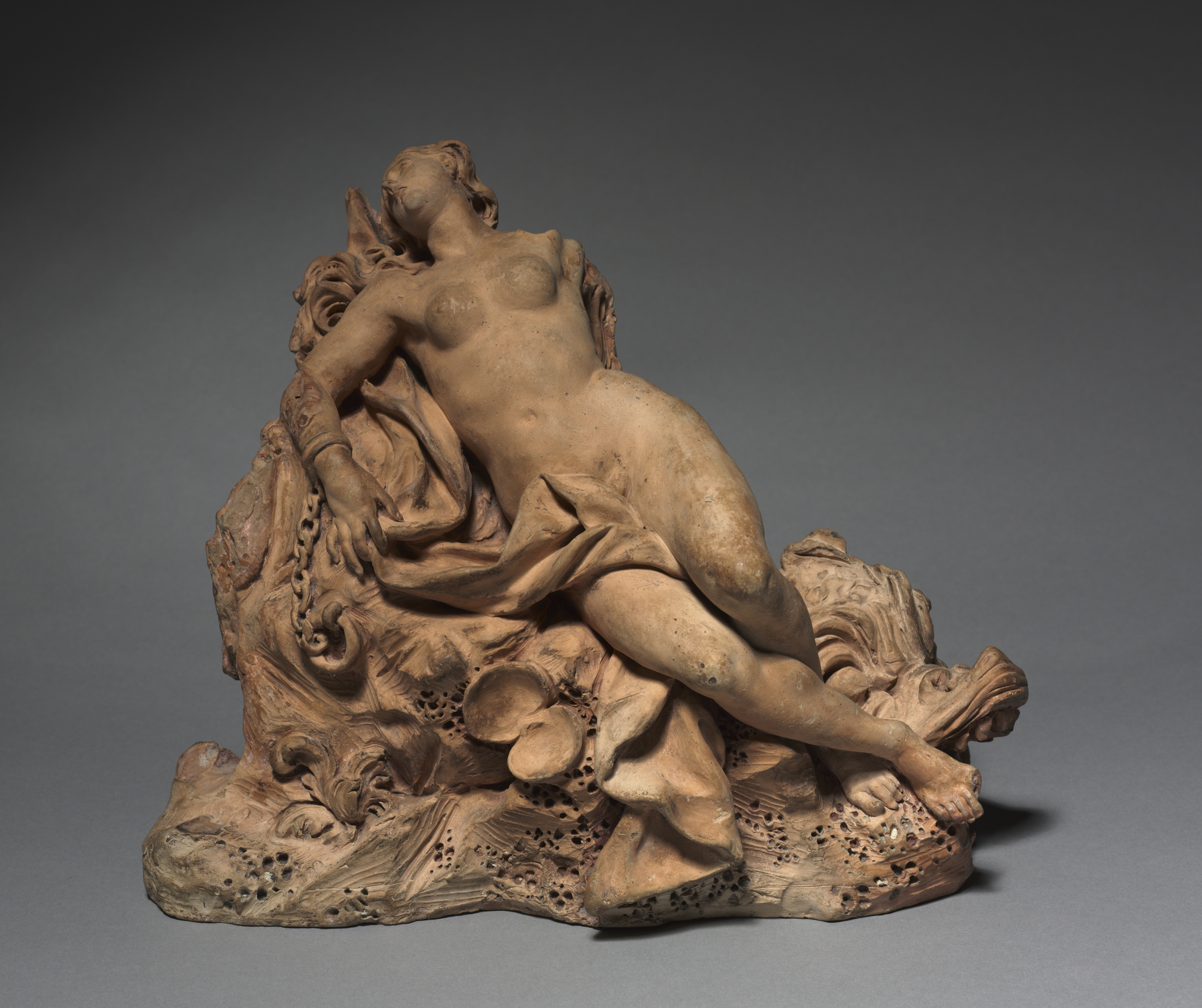 Terracotta sculpture of a reclining nude woman titled "Andromeda" by Antonio Tarsia. The woman is lying on her side on a rocky base adorned with sea sponges and shells. Her hair is styled in curls swept back from her face. Her left arm is bent at the elbow, resting on a cloth draped over her hip. Her right arm is bent with her hand near her chest. Her left leg is bent at the knee, while her right leg is extended. The sculpture is set against a dark gray background.