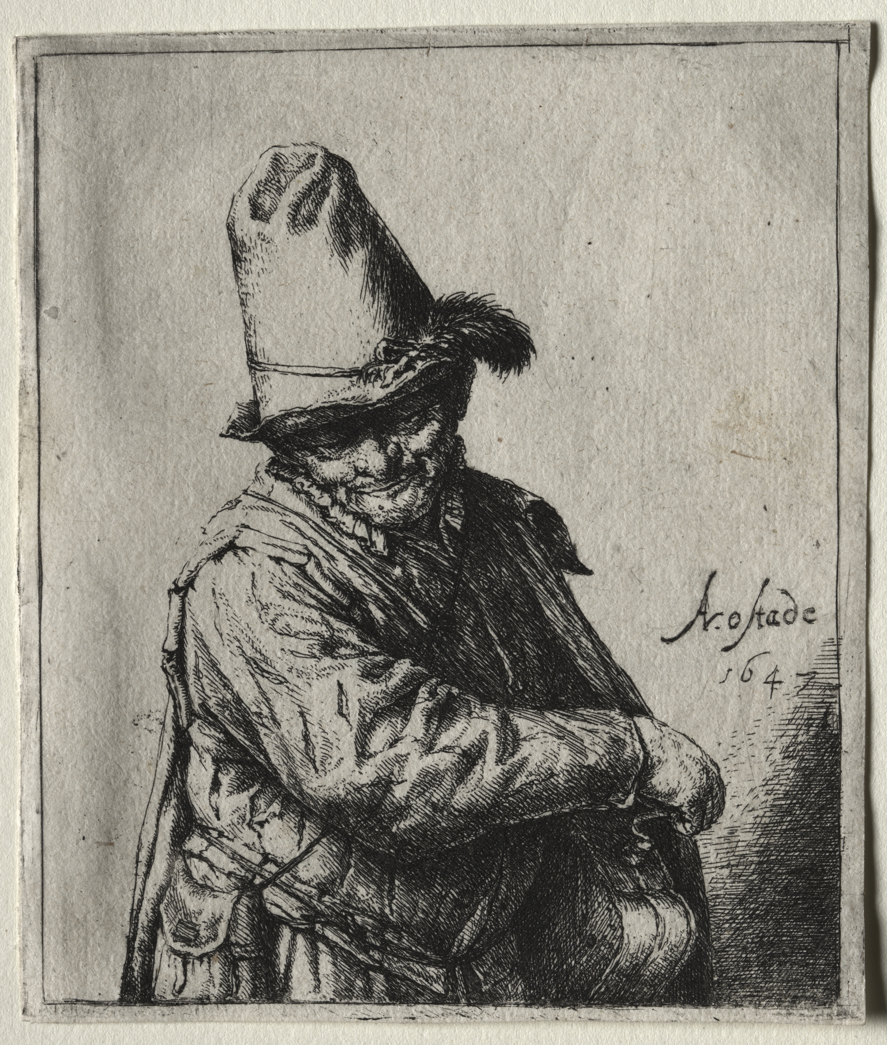 The Organ Grinder by Adriaen van Ostade: A black and white sketch of a man wearing a large hat with a feather, a cloak over his shoulder, and a bag or satchel hanging from his belt. He has a bushy beard and mustache. His head is tilted down and to the right. His right arm is bent at the elbow and his hand is near his body. The background is light gray. The image is framed by a thin black line. The artist's signature is visible in the lower right corner.