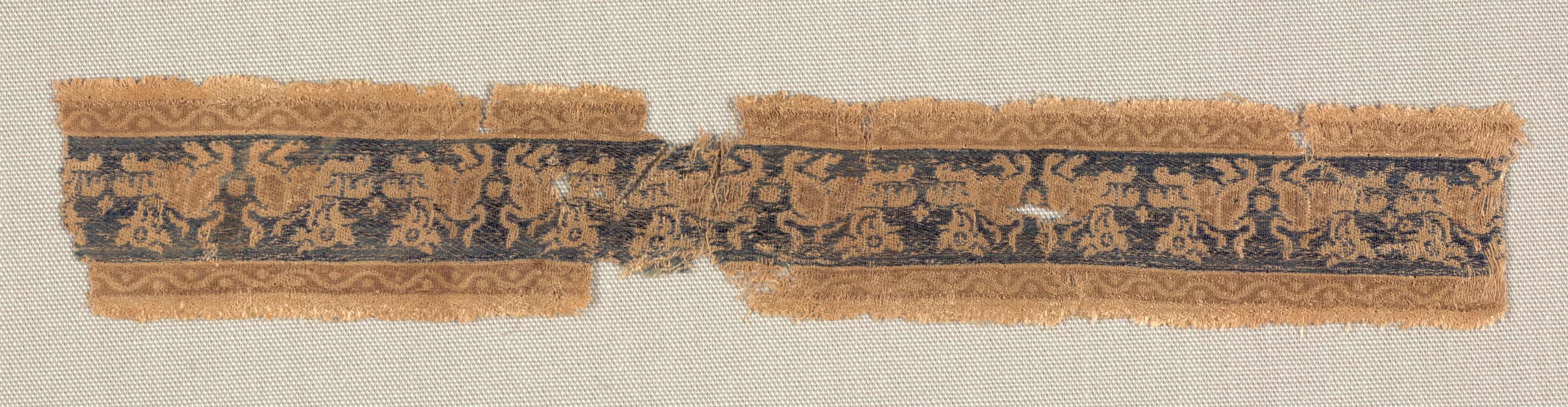 Rectangular piece of fabric with frayed edges, divided into two parts side by side. The top and bottom have a golden-brown color with a swirling pattern. The middle section is dark blue with a repeating golden-brown design. The background is beige fabric. Title: Fragment of Band or Border Artist: Unknown