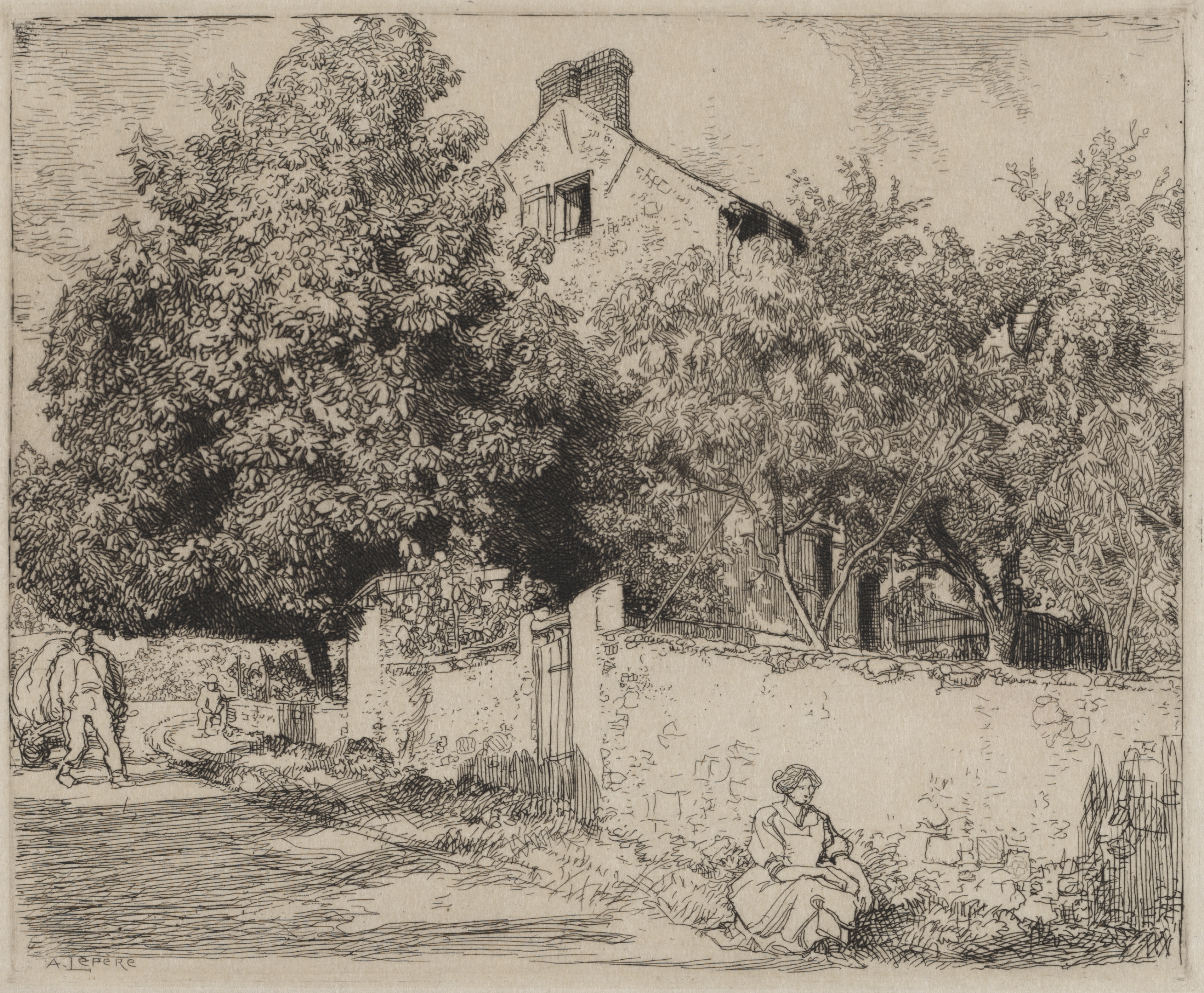 The House of Madame B. by Auguste Louis Lepère: A black and white drawing of a house behind trees and a short stone wall. A woman sits on the ground in front of the wall. A man walks on the road to the left.