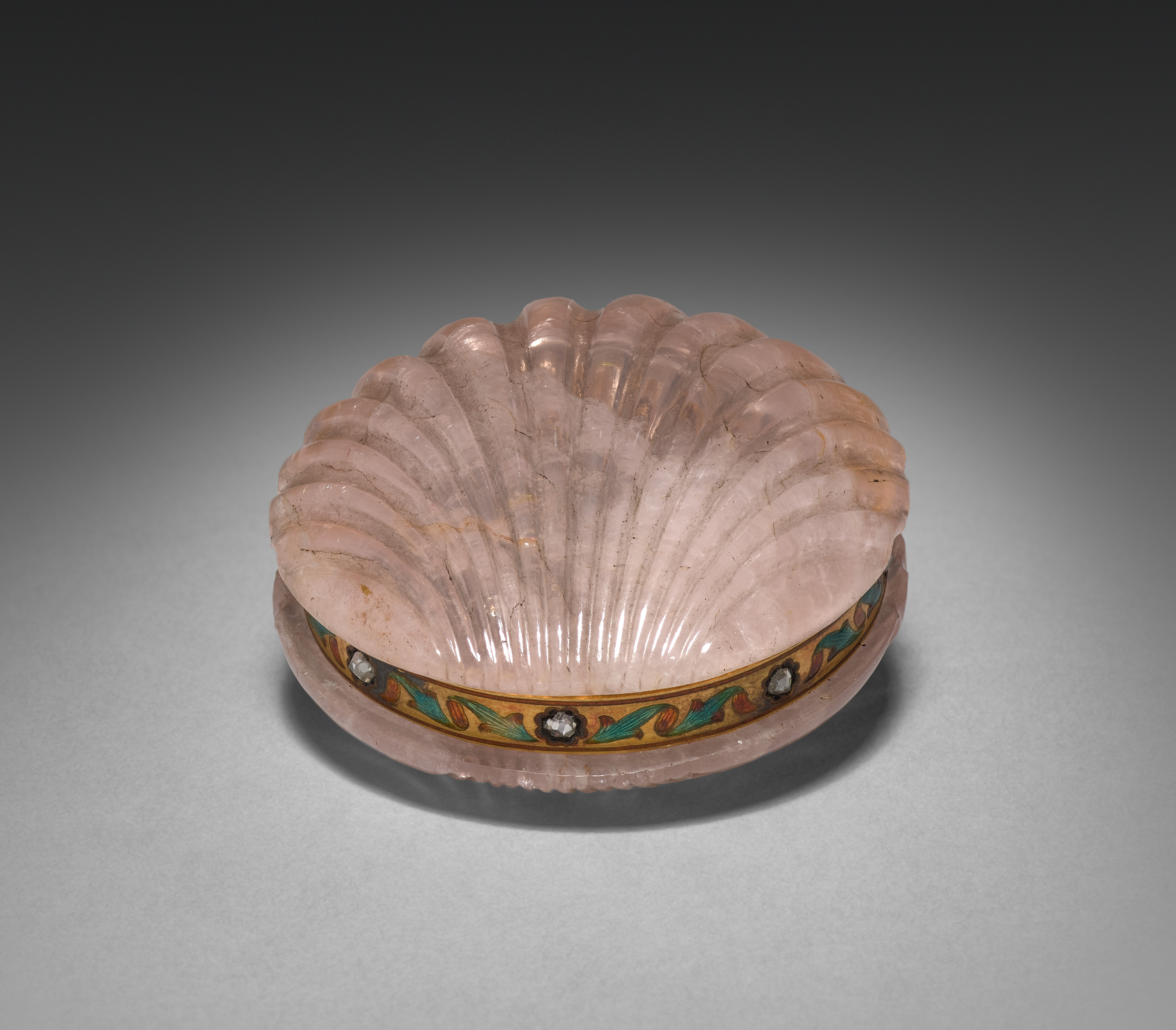Shell-Shaped Box by The box is pink with a scalloped edge and ridged interior. The box has a decorative band around the bottom, featuring a yellow background with green, orange, and red designs. There are four white gemstones set into the band, spaced evenly apart. The box appears to be made of stone or glass. The background of the image is gray, with a vignette effect that darkens towards the edges.