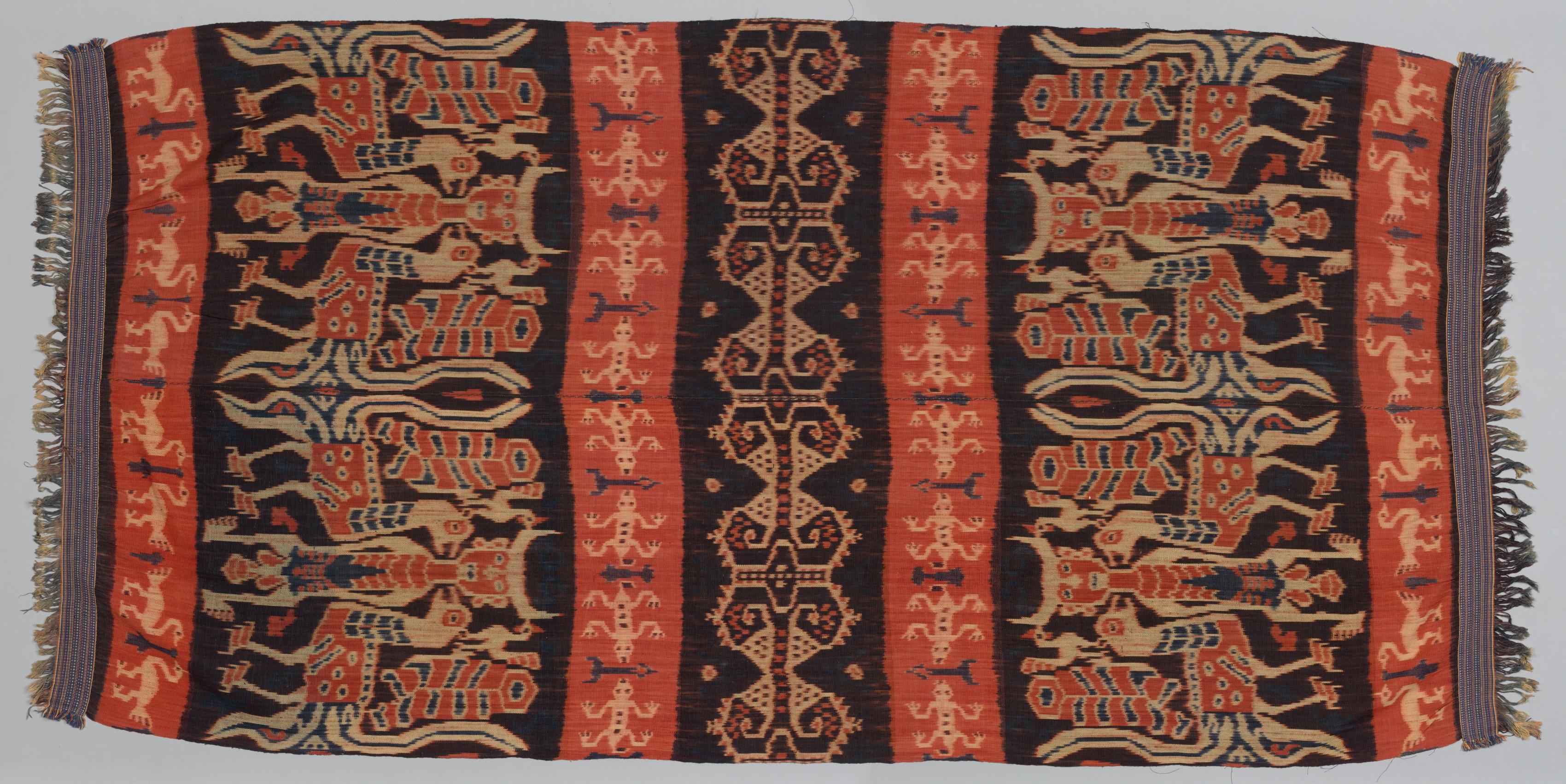 The textile titled "Hinggi" by the artist, has a rectangular shape with a predominantly black background and features a repeating pattern of vertical stripes. The stripes are primarily orange and black with intricate beige, orange, and blue designs. The designs include abstract shapes and figures of animals, possibly horses or deer, in various poses. The edges of the textile are bordered by a thin striped pattern and fringed with threads of various colors. The fringe appears to be made up of short, thin strands of yarn in shades of brown, orange, and black. The overall design is symmetrical, with identical patterns on either side of the central axis. The colors used are predominantly black, orange, beige, and blue. The texture of the textile appears to be woven, with a visible weave pattern. The image presents a clear view of the textile's surface, showcasing its intricate design and color scheme.