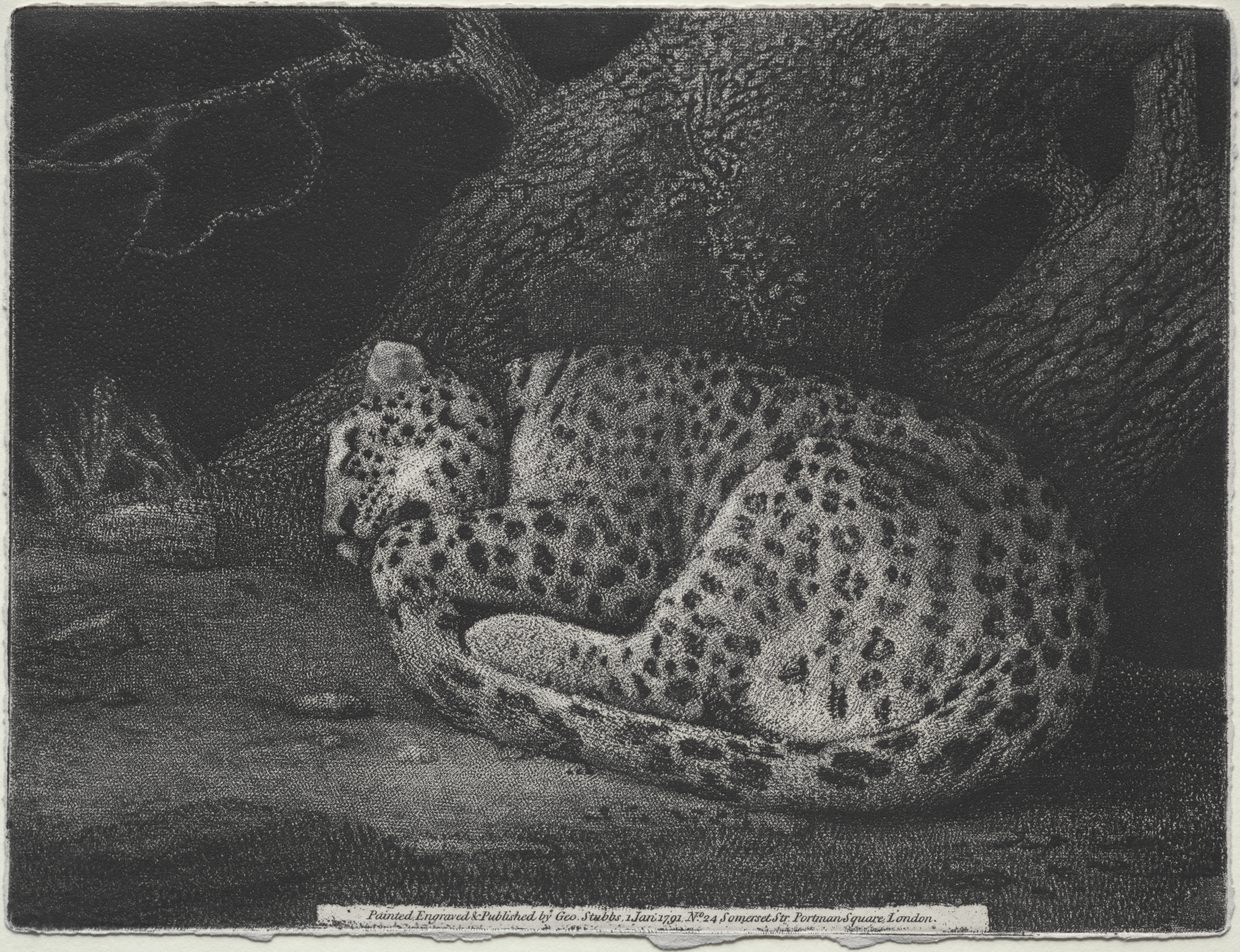 Black and white image of a leopard curled up and sleeping on the ground. The leopard has a light-colored coat with many dark spots. Its head is resting on its front paws. The leopard is facing left. Behind the leopard is a tree trunk. The background is dark. A small section of text appears at the bottom. The image is titled "A Sleeping Leopard" by George Stubbs.