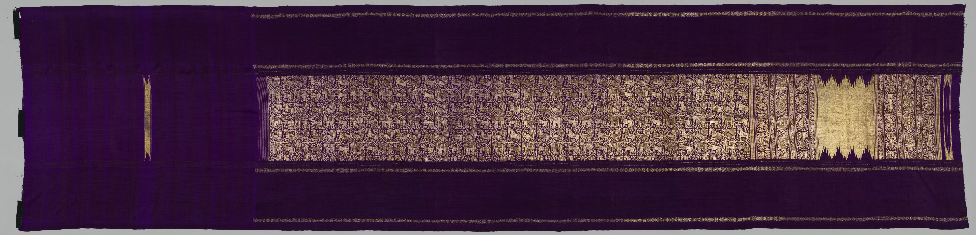 The image shows a rectangular piece of fabric titled "Sari" by an unknown artist. The fabric is dark purple with a lighter gold-colored section in the center. The gold section is divided into multiple panels; the left and right panels have intricate designs. The center panel features a repeating pattern of small, intricate designs. There are three horizontal stripes on the fabric, one above and one below the gold section and one at the bottom; these stripes are dark purple with a thin gold line on top and bottom. The fabric appears to be laid flat on a surface with a light gray background. The edges of the fabric are rough and uneven. The right edge of the fabric has a series of small triangular points along the top. The fabric has a few creases and folds.