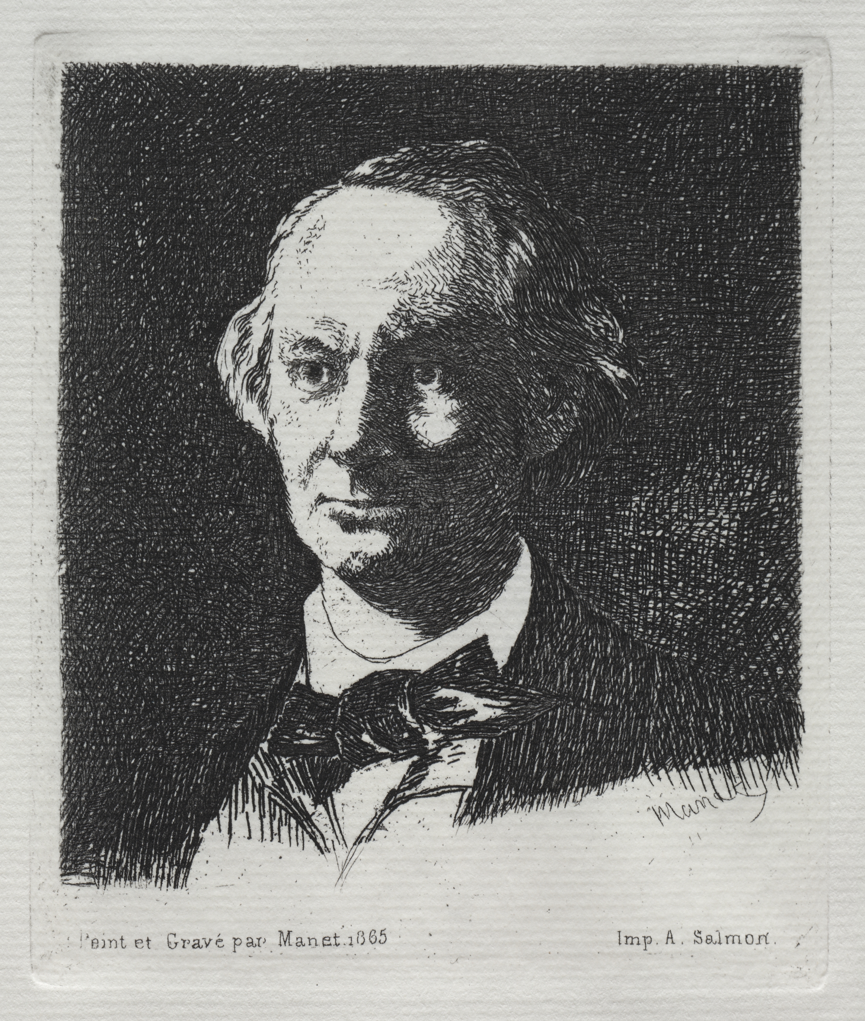 Black and white portrait of a man with a serious expression. The man has wavy hair parted on the side, receding at the temples. He wears a dark jacket with a white collared shirt and a dark bow tie. The image is drawn in a detailed, realistic style with heavy shading behind the man. The background is dark with scribbled lines. A border surrounds the drawing. Small text at the bottom reads "Peint et Grave par Manet. 1865" on the left and "Imp. A. Salmon" on the right.