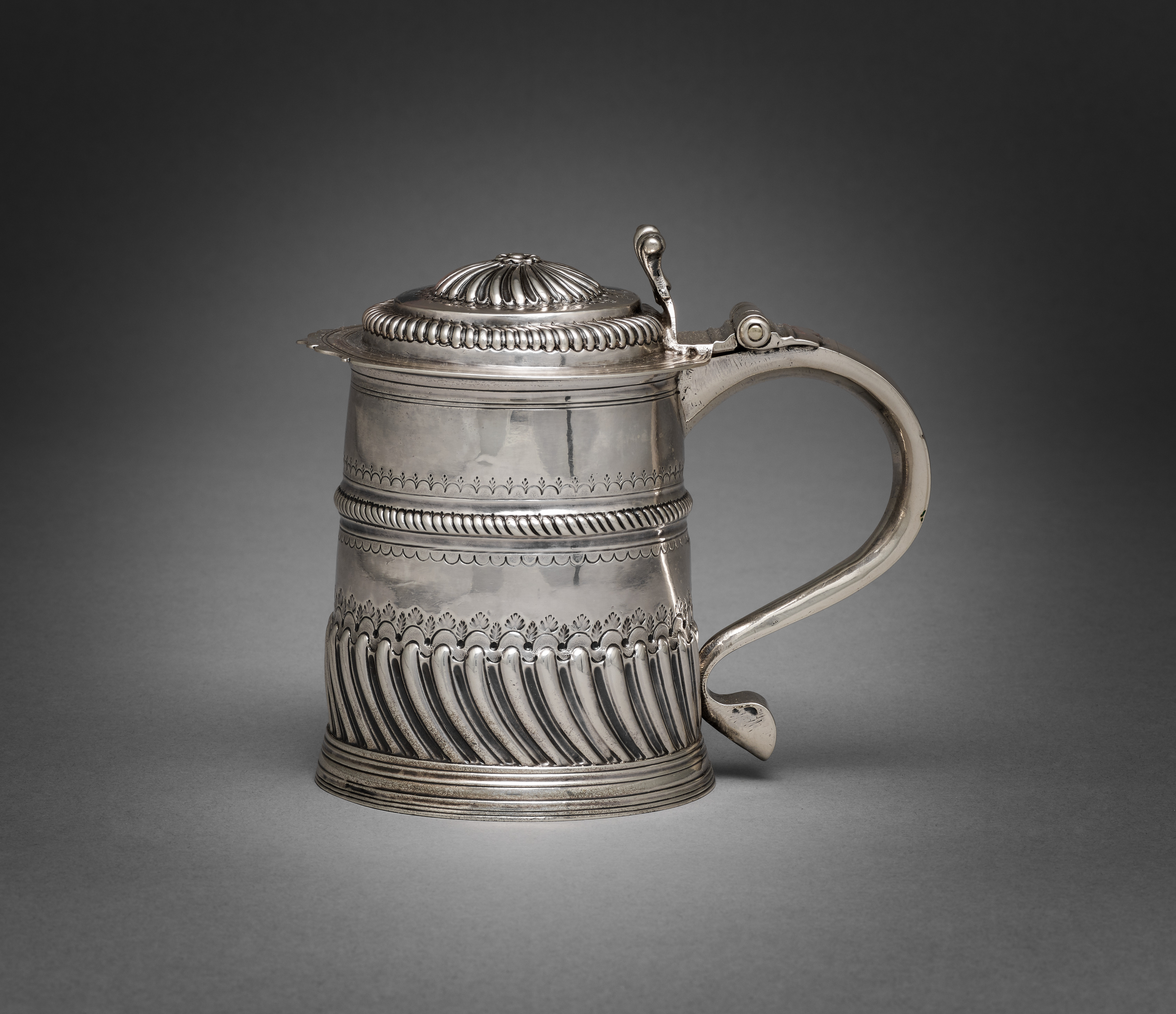 Silver tankard with a domed lid and handle on the right side. The tankard is cylindrical with a slight narrowing at the top. The handle curves downward and is attached to the body with a scroll-like decoration. The lid features a domed shape with a decorative edge and a small finial on top. The body has three horizontal bands of decoration around the middle and lower sections. The middle band features a rope-like design and a band of small shells or flowers. The lower band features a series of curved, overlapping shapes resembling leaves or feathers. The background is dark gray, with a lighter gray area behind the tankard.