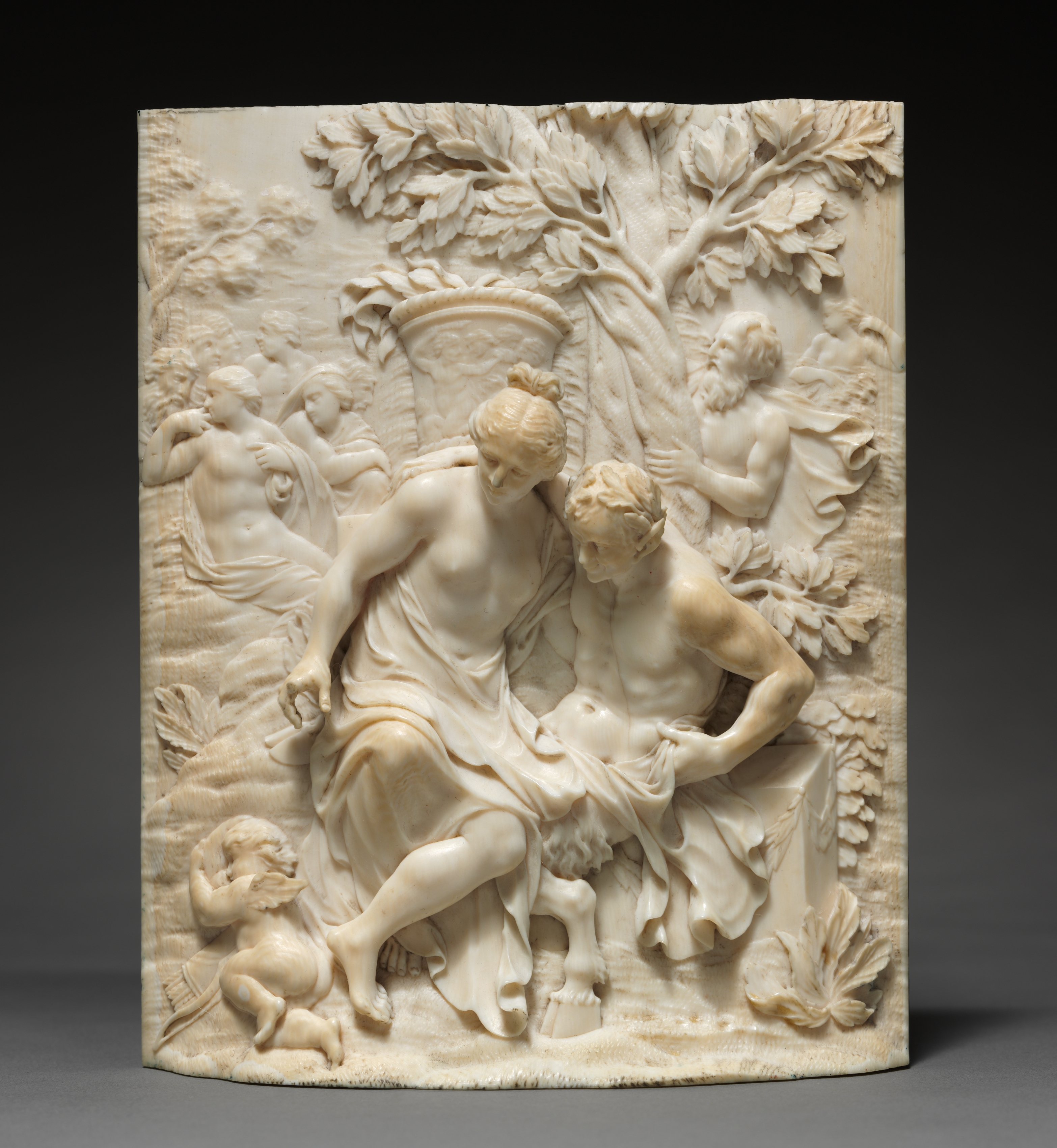 Venus and a Satyr by Ignaz Elhafen. A relief sculpture made of white marble or ivory. The relief is rectangular with a curved front. The scene depicts a woman with long hair, wearing a flowing cloth wrapped around her body sitting on a man's left leg. The woman faces the right. The man has short hair, sits on the left, is shirtless, and wears a cloth wrapped around his lower body. The man looks down. A small winged figure, a cherub or putto, sits on the man's right shoulder. A small figure and a dog are at the bottom left. Two more figures are behind the woman on the right, one sitting in a tree. Leaves and foliage are throughout the scene. The background is black, transitioning to gray at the bottom.