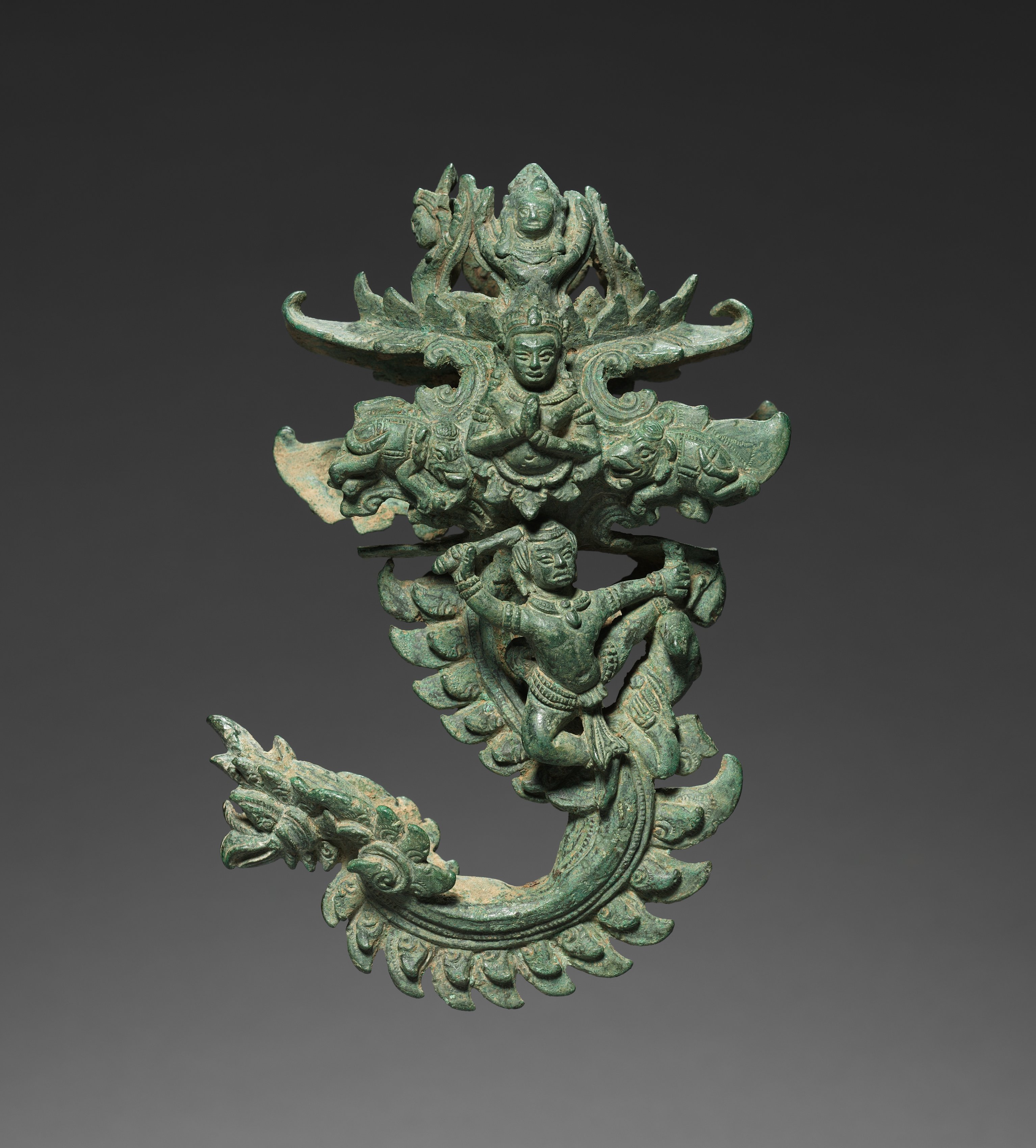 Greenish metal sculpture of Palanquin Hook by an unknown artist. The sculpture depicts multiple human-like figures emerging from a curving dragon-like creature with a long tail. The figures appear to be dancing or in dynamic poses. The sculpture has a weathered patina and appears to be made of bronze or copper.