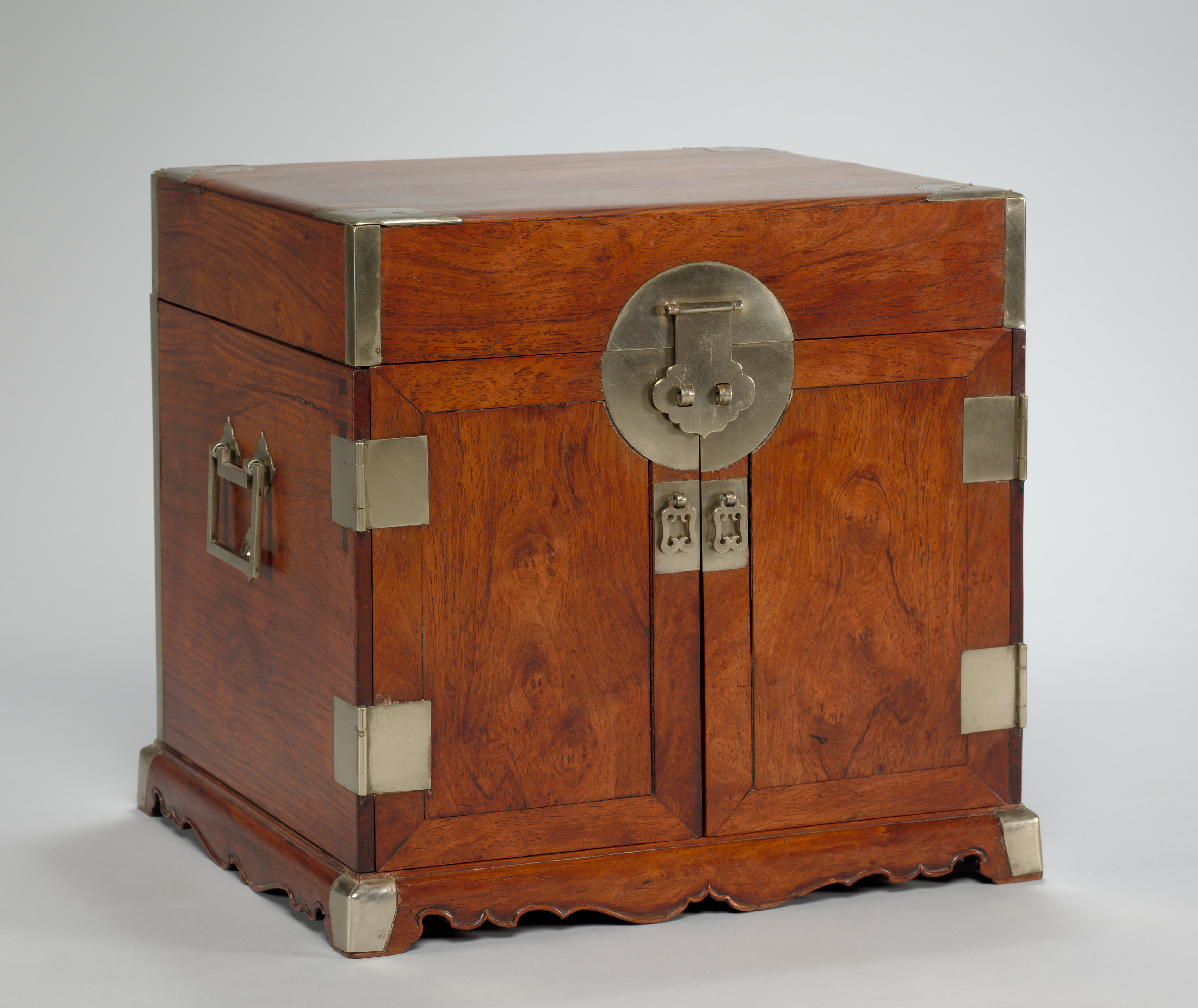 Small Chest with Inner Drawers by artist. Wooden chest with reddish-brown wood grain. Square shape, slightly wider at bottom than top. Metal corners. Large metal circle on front with handle. Two small metal pieces below circle. Small metal handle on side. Wavy bottom edge. Metal plates on bottom corners. Plain white background.