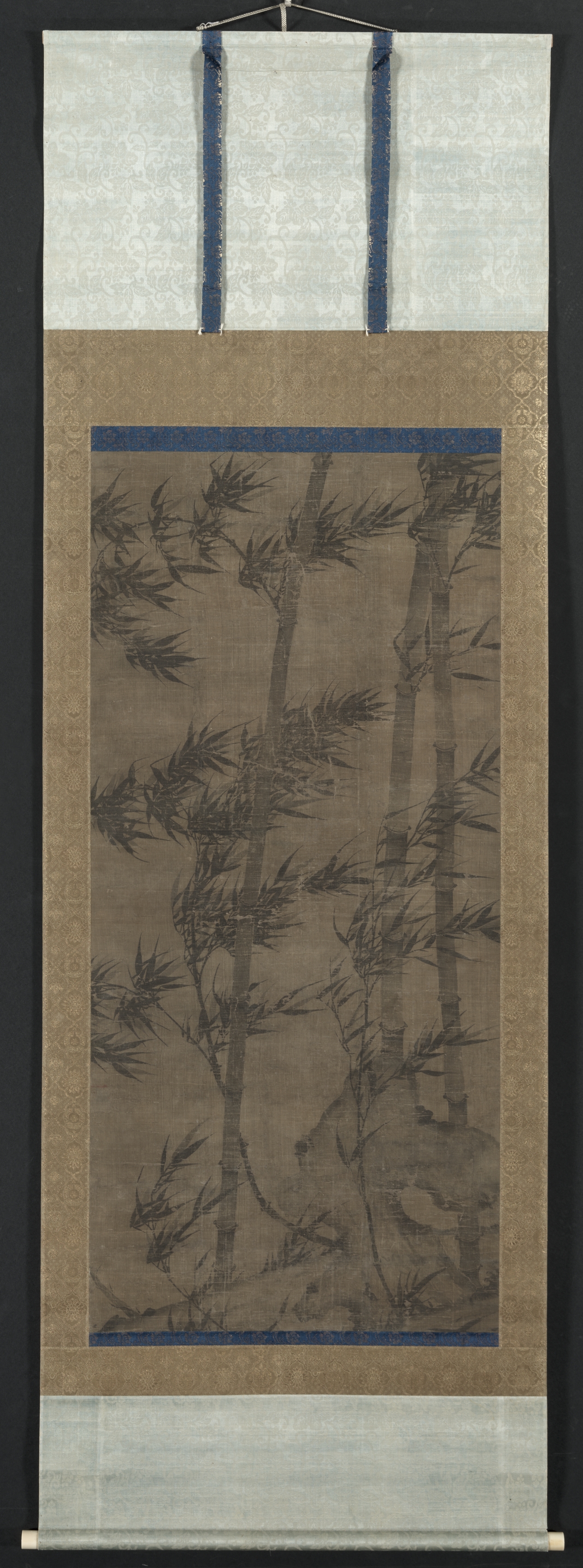 Vertical scroll painting with white top and bottom sections. Top section has a subtle texture and two blue strips. Bottom section is plain. Central section is large and brown with a blue border and a tan border. Dark brown bamboo stalks with leaves are depicted on the central section. Tan border has a repeating diamond pattern. The scroll has a small wooden dowel at the bottom. The title is "Bamboo in Four Seasons: Summer" and the artist is unknown.
