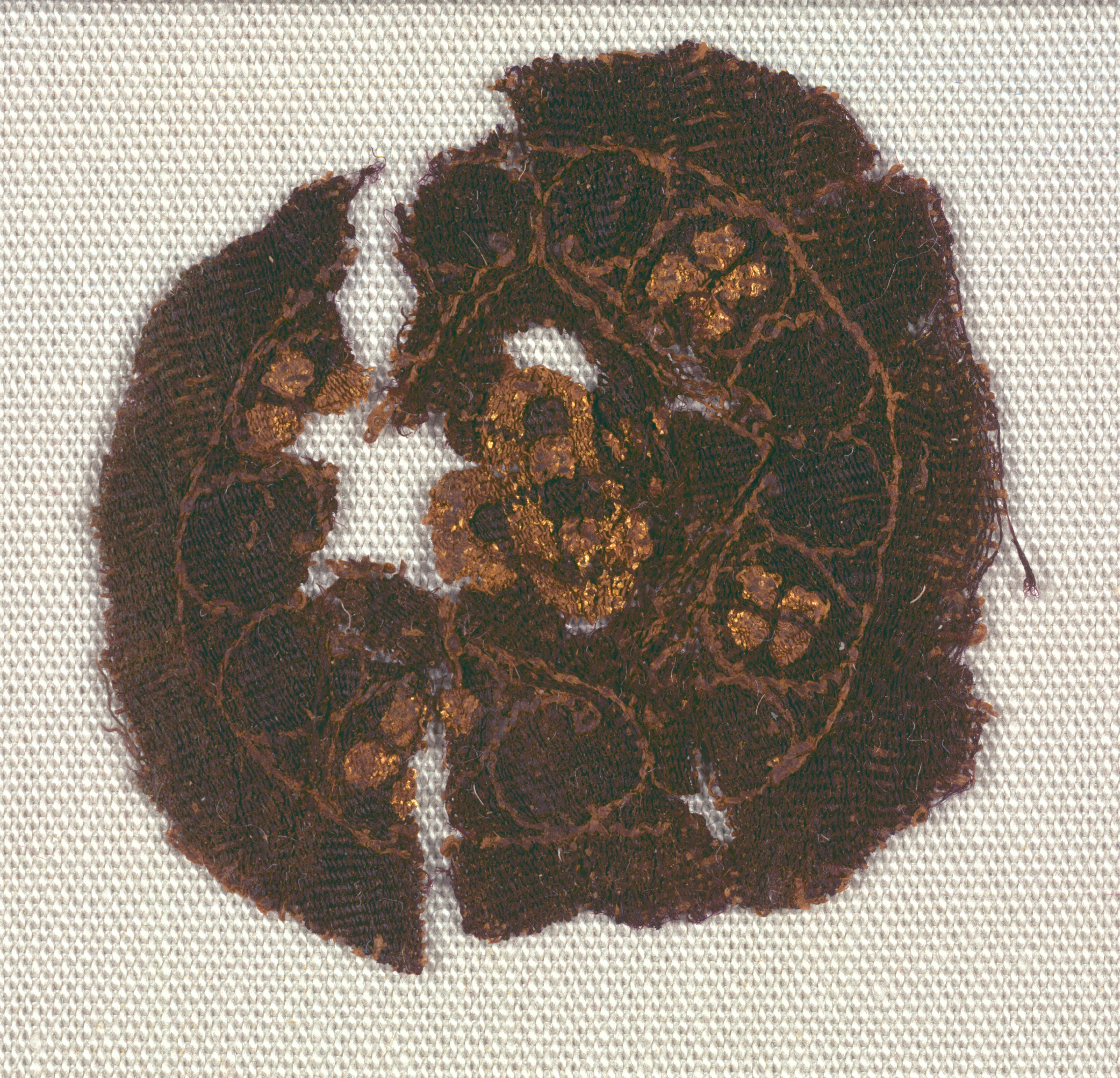 Dark brown circular fabric piece with gold accents, on a white background. The fabric is broken into several sections, with rough edges. It features a pattern of gold shapes, possibly flowers or leaves, arranged in a repeating design. The gold accents are shiny and reflective. The fabric appears to be old and worn, with visible signs of aging and deterioration. The white background is textured, resembling canvas or a similar material.