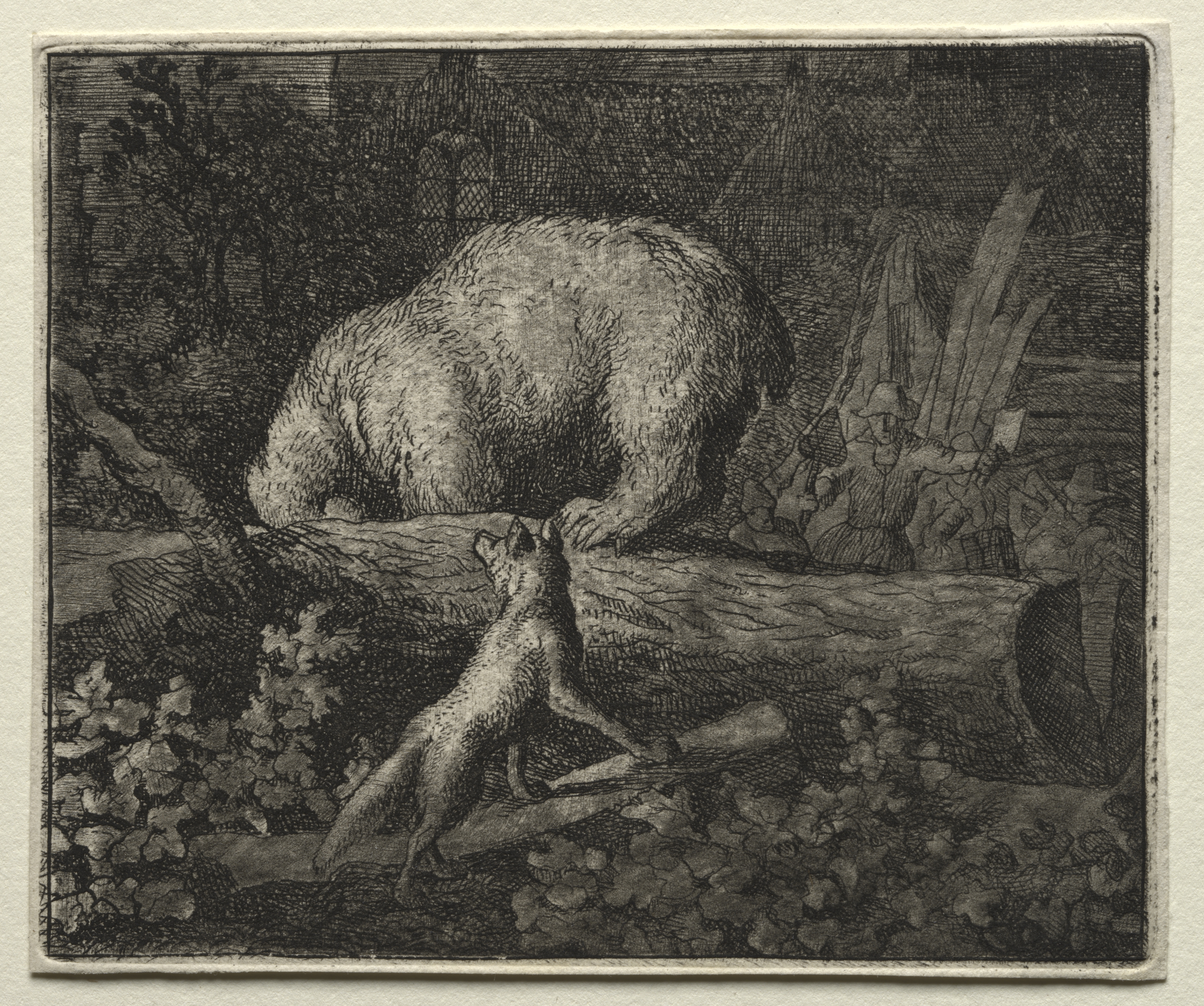 Black and white depiction of a large bear and a smaller fox. The bear is hunched over with its head down in the middle of the image. The fox stands on its hind legs on the left. The bear and fox are separated by a fallen tree trunk. The scene is set in a wooded area and there are trees and foliage throughout. In the background on the right, there appear to be two people. The image is a woodcut or engraving. The image is bordered with a white frame.
