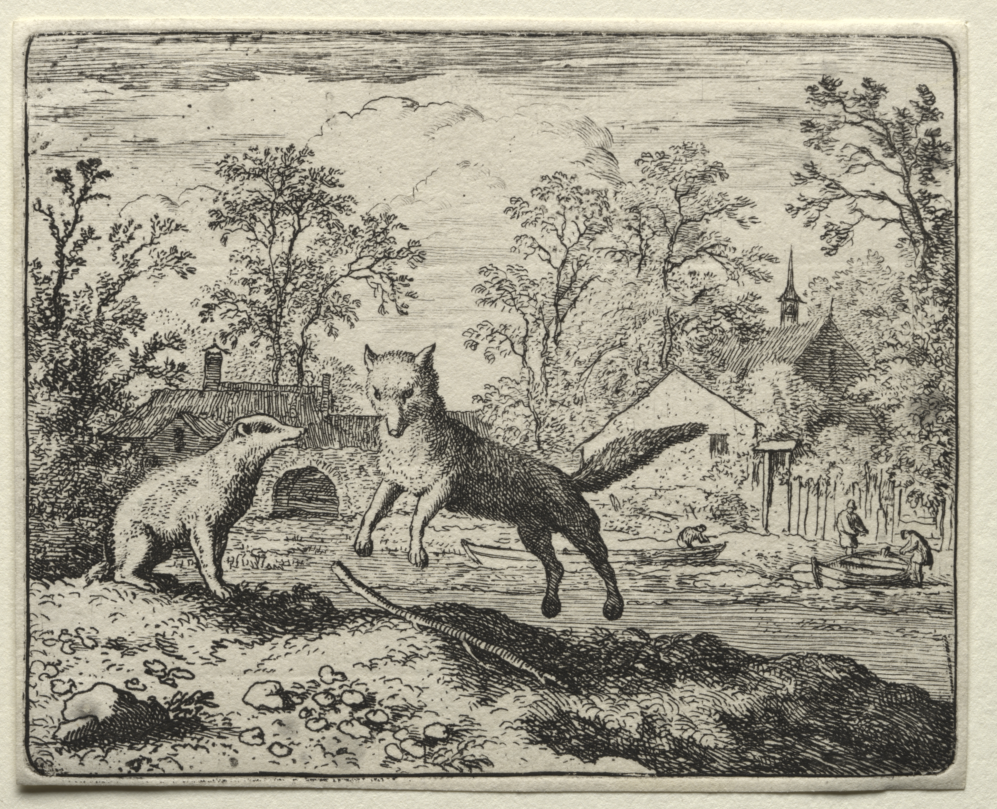 Black and white drawing of a fox and a badger outdoors. The fox is centered and standing on thin legs. The badger stands to the left. There are trees, a bridge, and a house in the background. A body of water runs along the right. A man and woman are on the water's edge on the right.